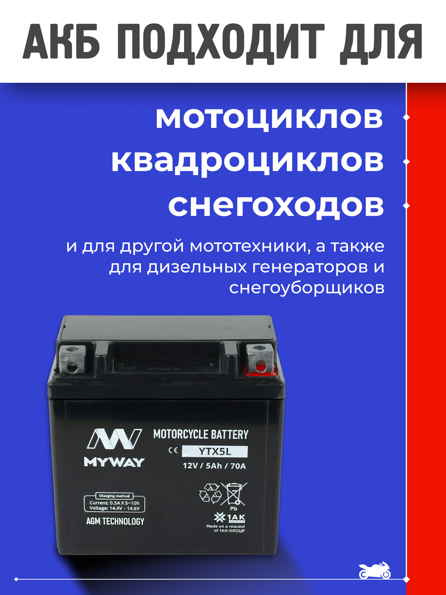 Аккумулятор на мотоцикл 12 вольт 5ah AGM для мопеда, скутера 1 755 ₽