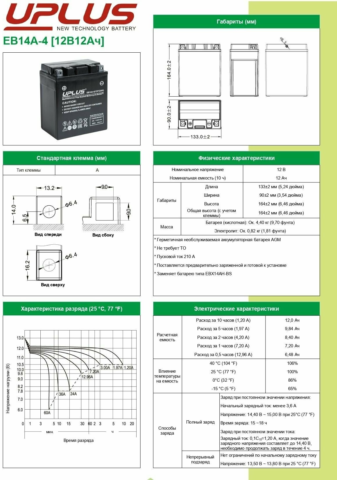 Аккумулятор для мото и гидротехники UniPLUS High Perfomance AGM 12 А/ч 210 А прям. пол. залит/заряжен EB14A-4 (133х90х164) YTX14AH-BS YB14-BS информация: