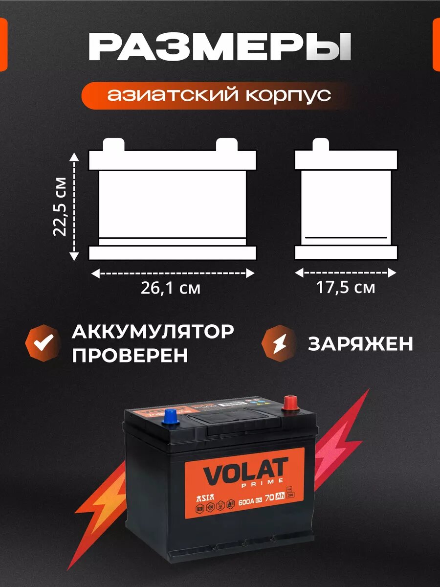 Отзывы на Аккумулятор автомобильный VOLAT Prime Asia (нижний борт) 70 Ah 600 A обратная полярность 261x175x225