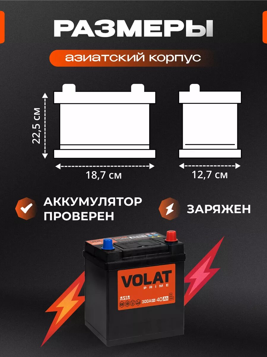 Аккумулятор автомобильный VOLAT Prime Asia 40 Ач (без борта) 300 A обратная полярность 187x127x225 мм информация: