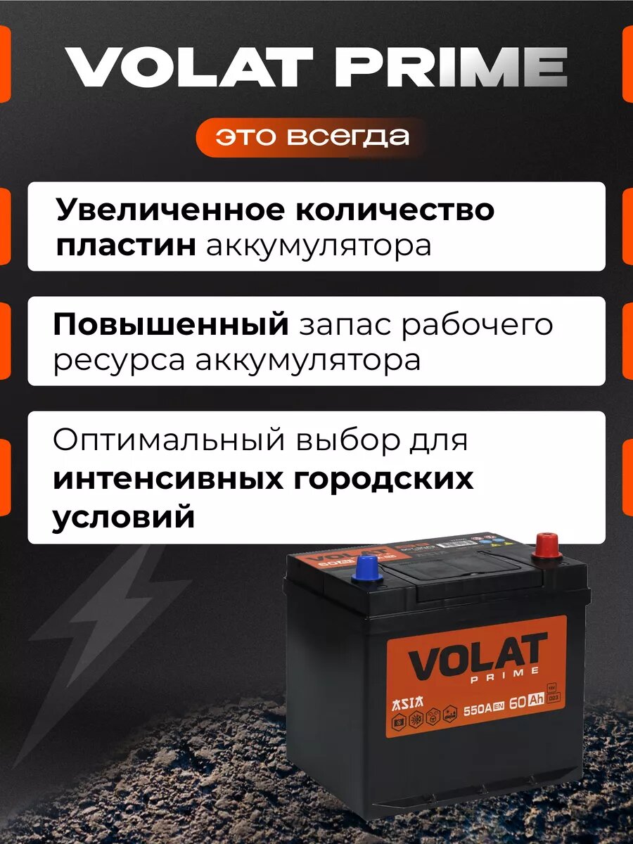 Аккумулятор автомобильный VOLAT Prime Asia (нижний борт) 60 Ah 550 A обратная полярность 230x179x225 информация: