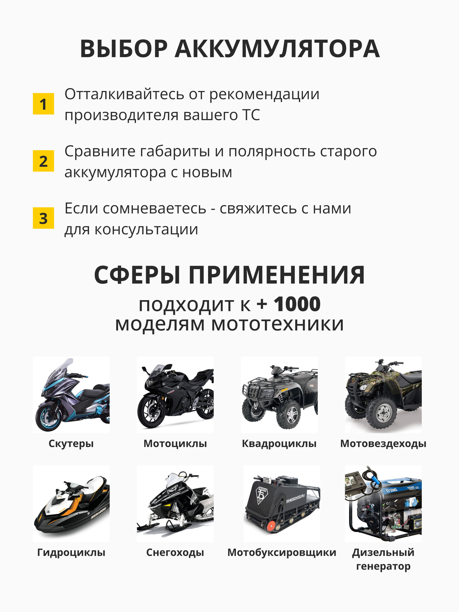 | Тип автотехники | водный транспорт / мототехника / генератор / квадроцикл / скутер |