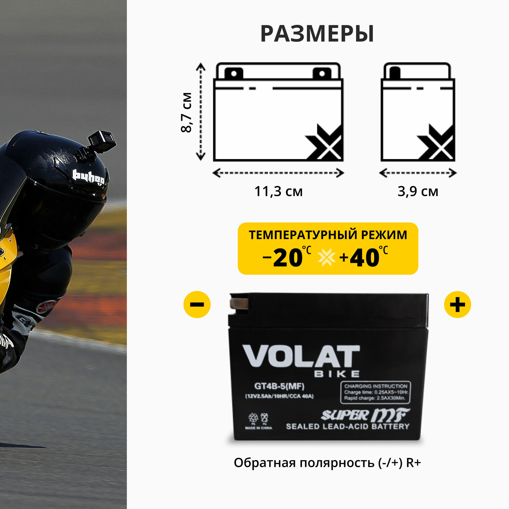 Отзывы на Аккумулятор для мотоцикла 12v Volat GT4B-5(MF) обратная полярность 2.5 Ah 40 A AGM, акб на скутер, мопед, квадроцикл, мотоцикл