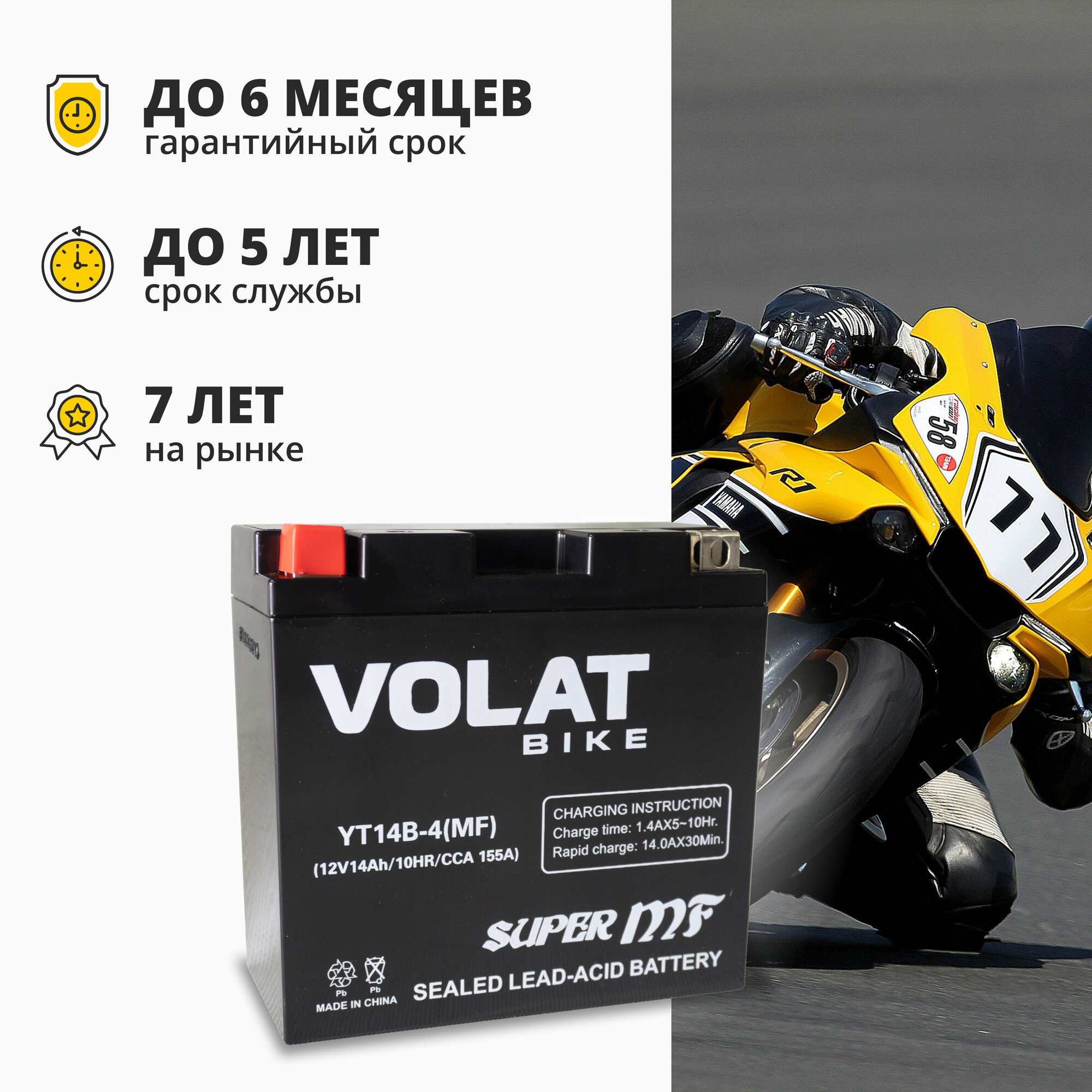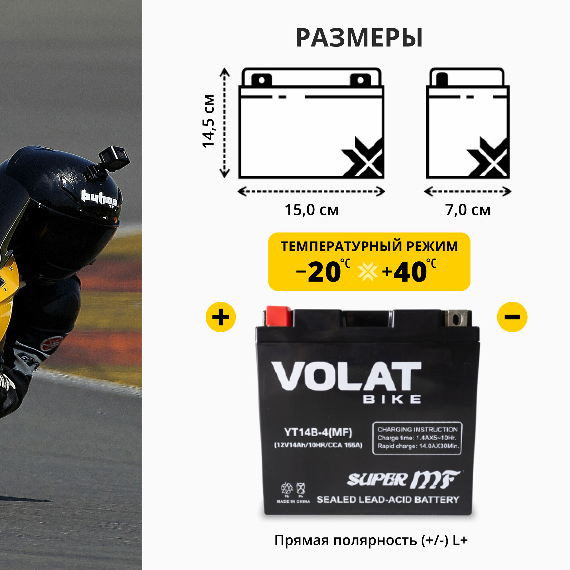 Отзывы на Аккумулятор для мотоцикла 12v Volat YT14B-4(MF) прямая полярность 14 Ah 155 A AGM, акб на скутер, мопед, квадроцикл, мотоцикл