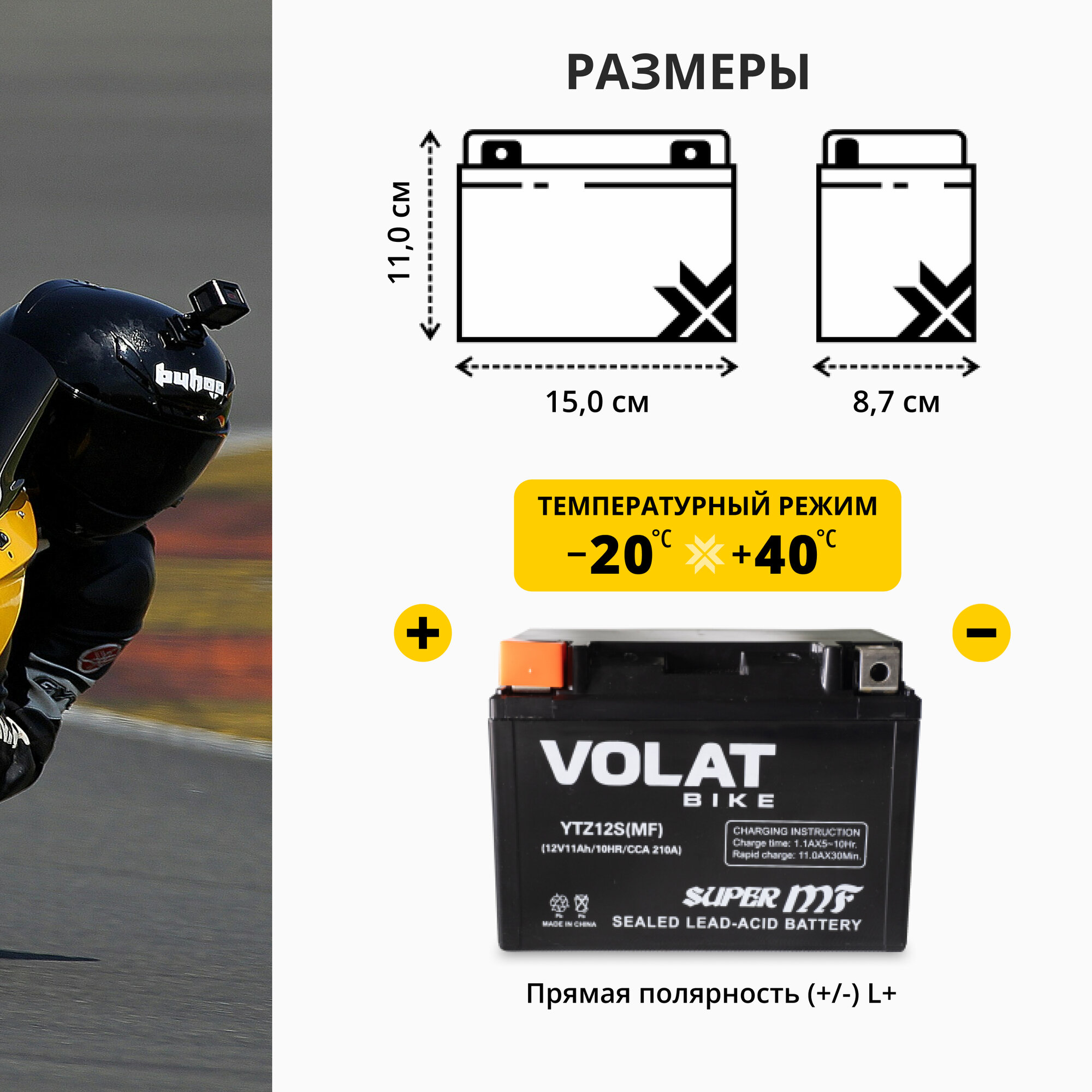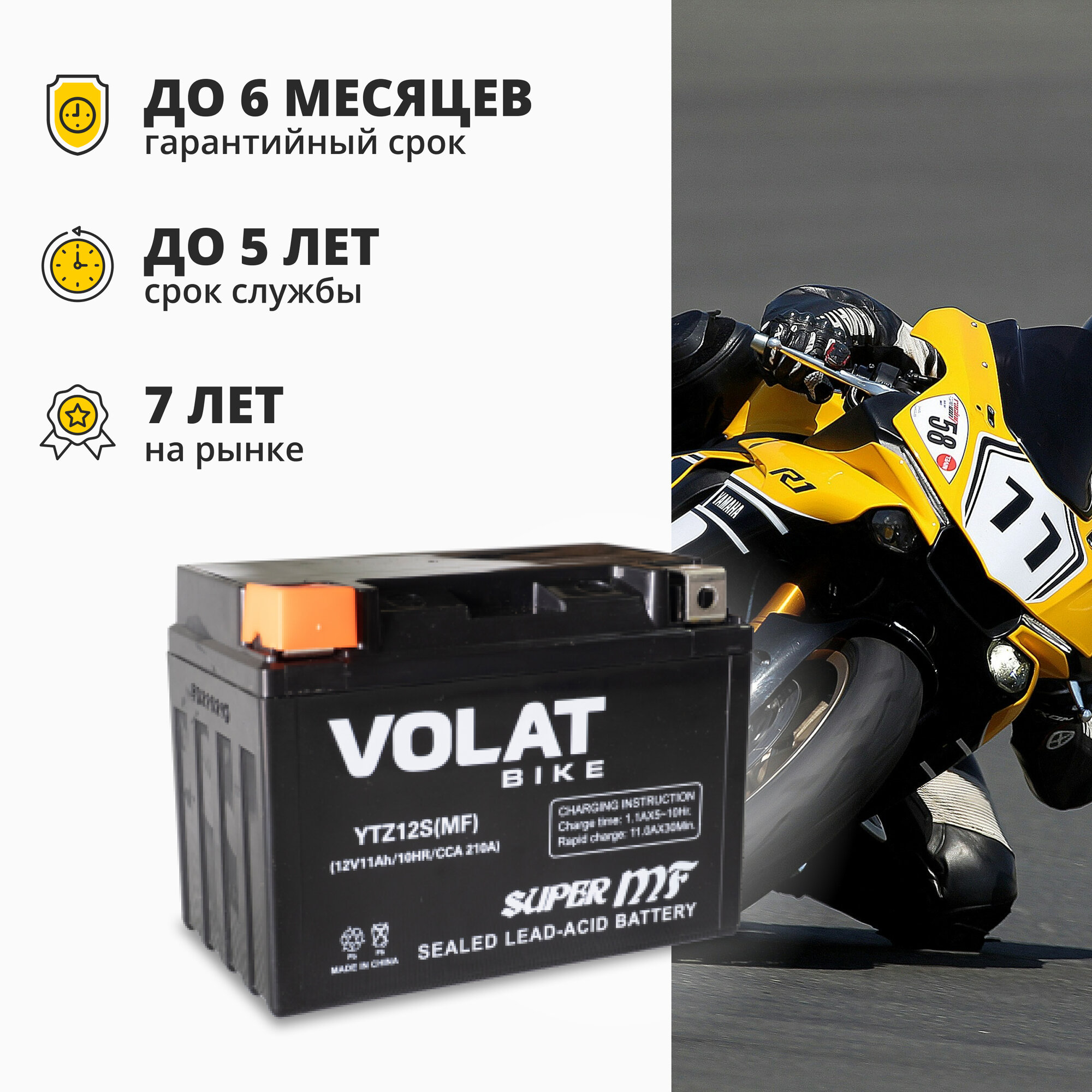 Отзывы на Аккумулятор для мотоцикла 12v Volat YTZ12S(MF) прямая полярность 11 Ah 210 A AGM, акб на скутер, мопед, квадроцикл, мотоцикл