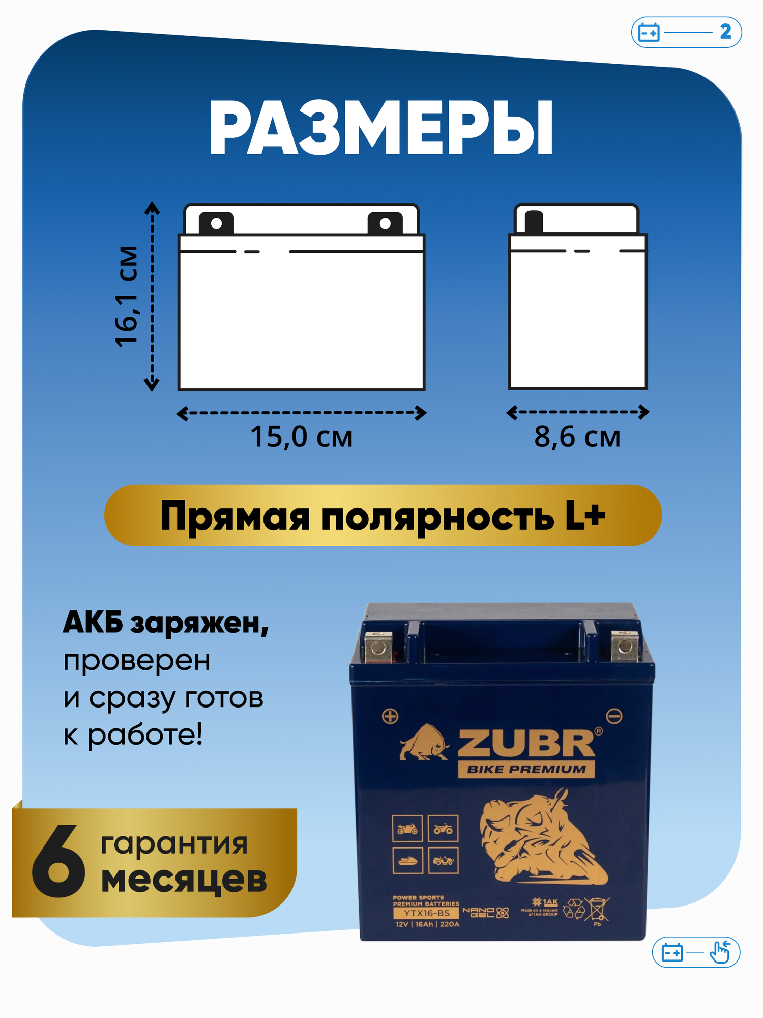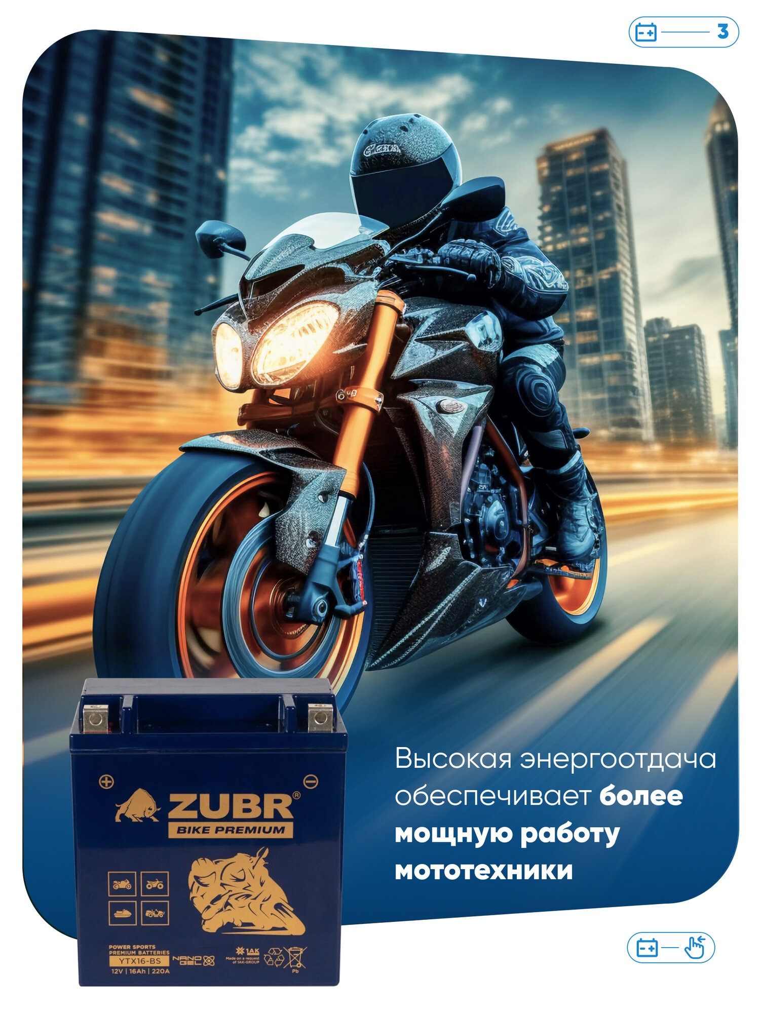 Отзывы на Аккумулятор для мотоцикла 12v ZUBR BIKE PREMIUM YTX16-BS (NANO-GEL) прямая полярность 16 Ah 220 A гелевый, акб на скутер, мопед, квадроцикл, мотоцикл