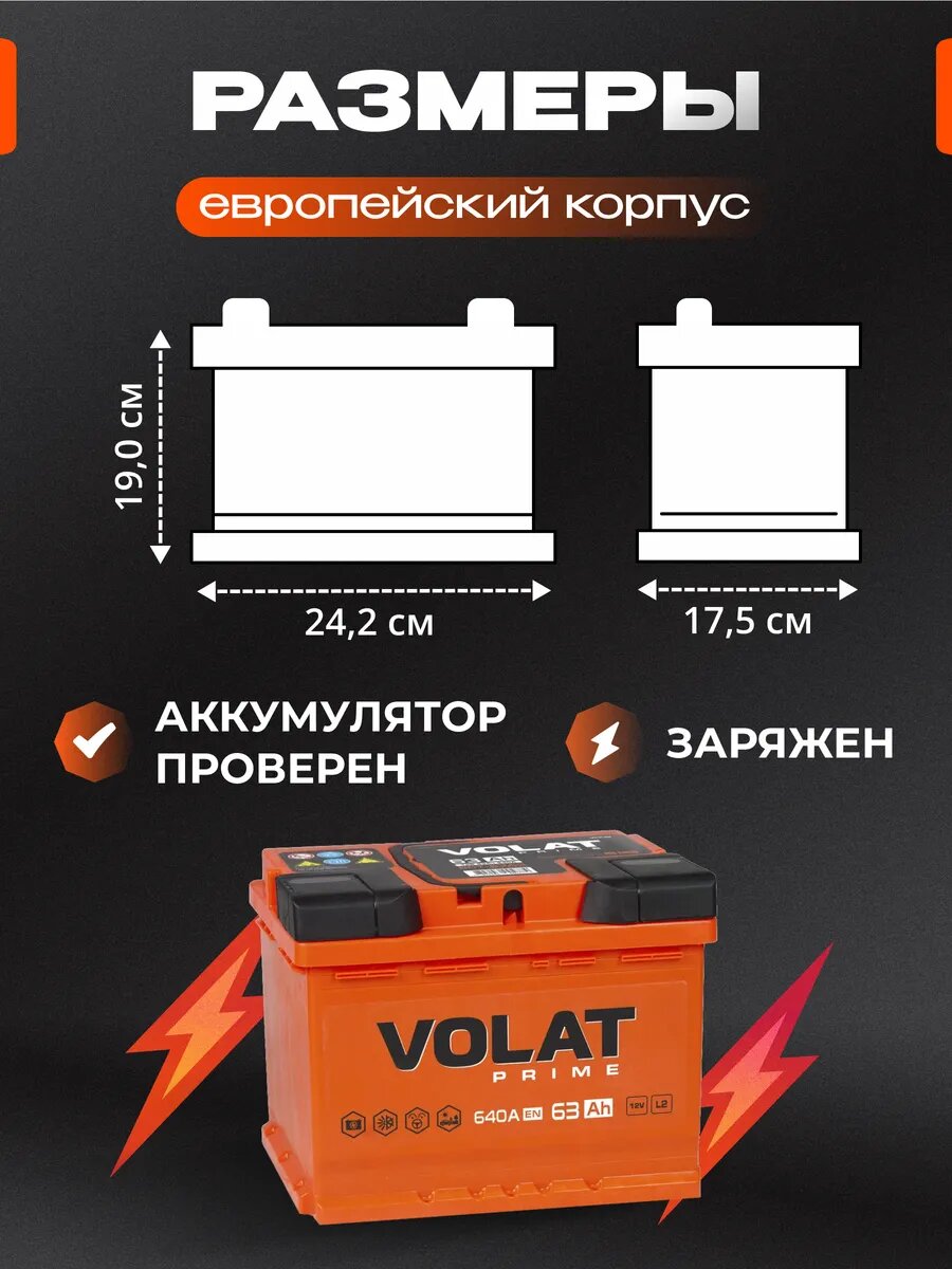 Аккумулятор автомобильный VOLAT Prime 63 Ah 640 A обратная полярность 242x175x190 информация: