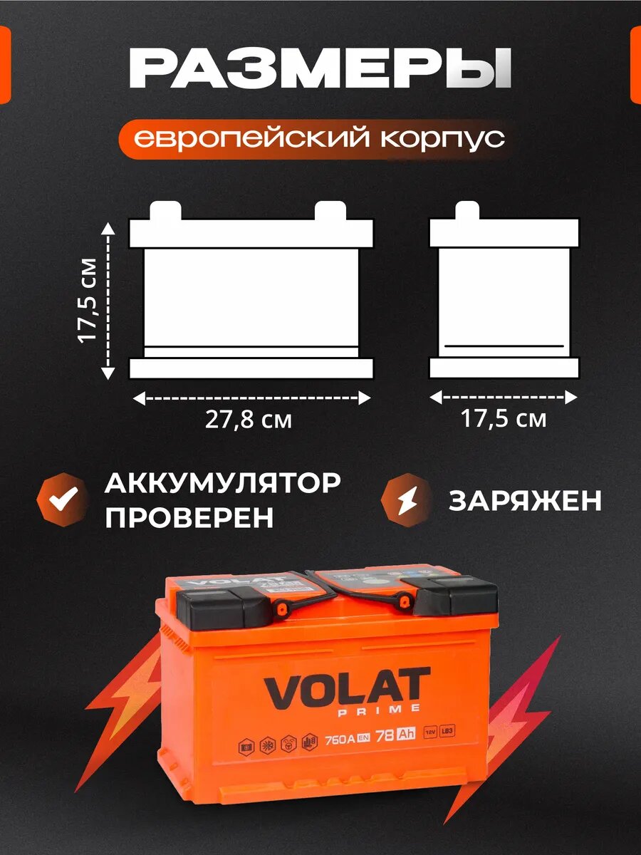 Отзывы на Аккумулятор автомобильный VOLAT Prime (низкий) 78 Ah 760 A обратная полярность 278x175x175
