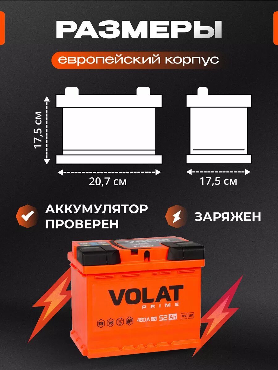 Аккумулятор автомобильный VOLAT Prime 52 Ач (низкий) 480 A прямая полярность 207x175x175 мм информация: