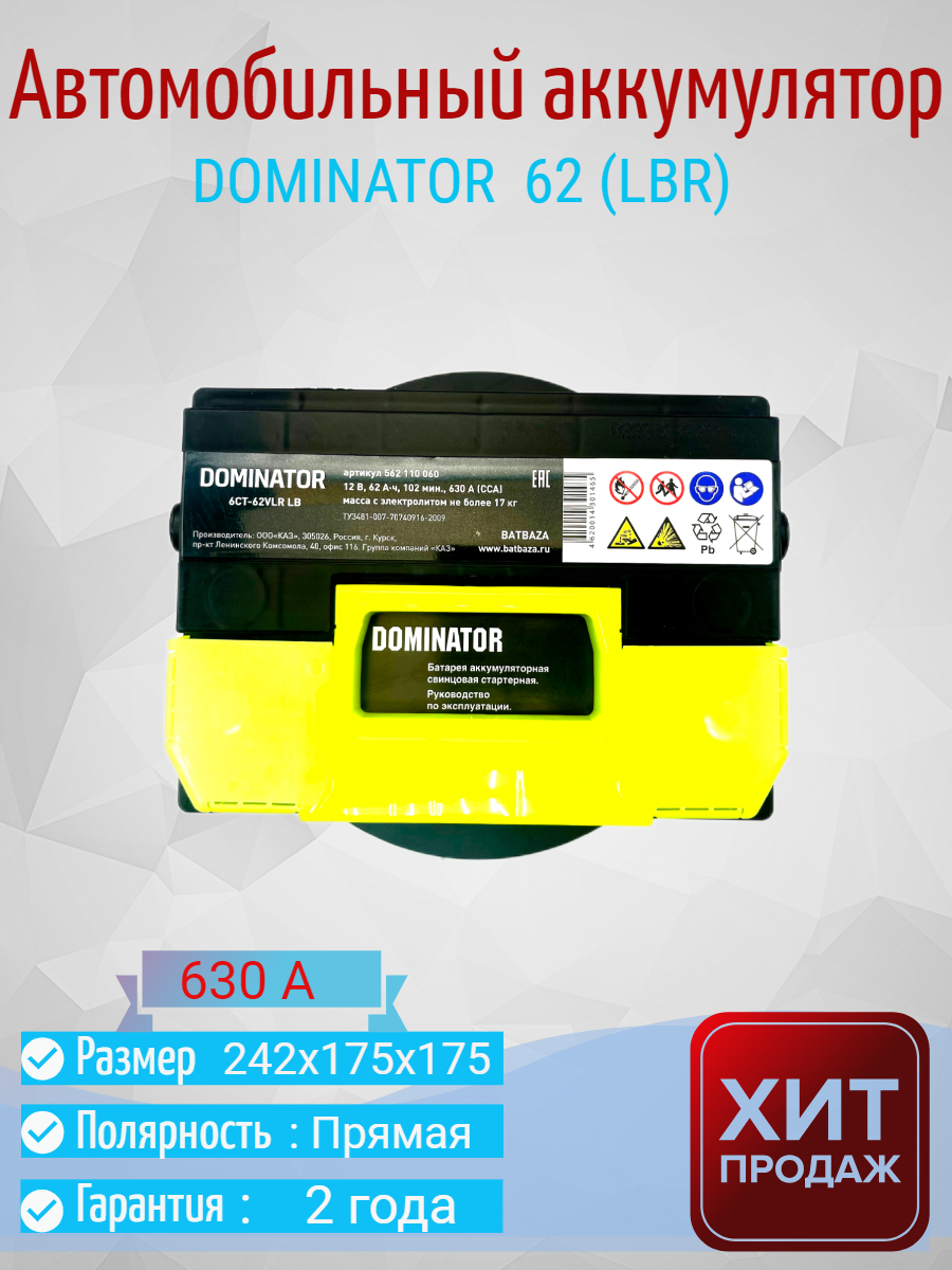 Автомобильный аккумулятор DOMINATOR 6ст- 62 (LBR) обратная полярность низкая информация: