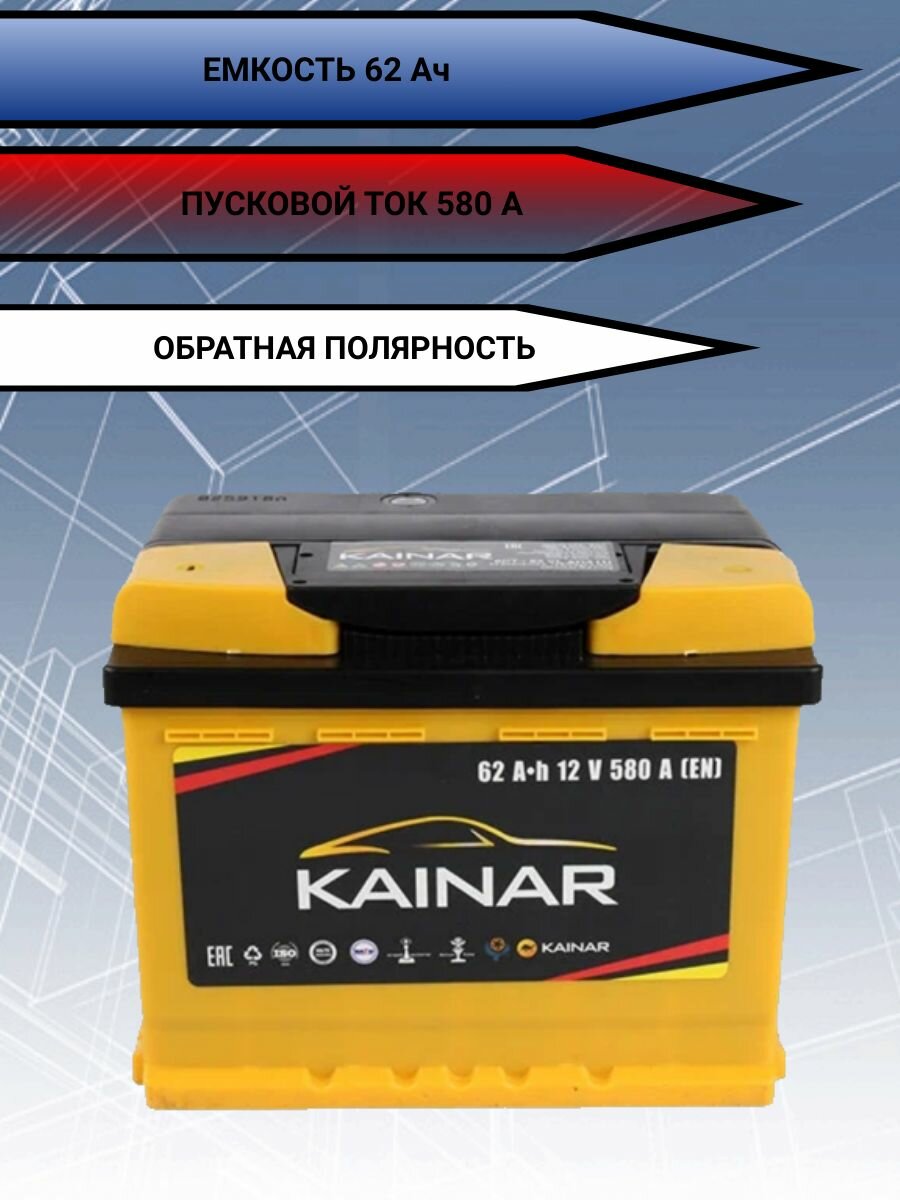 Автомобильный аккумулятор 12v KAINAR 6ст-62 Ач обратная полярность на легковую машину Lada Vesta, Largus, X-Ray, Daewoo Nexia, Hyundai i30 информация: