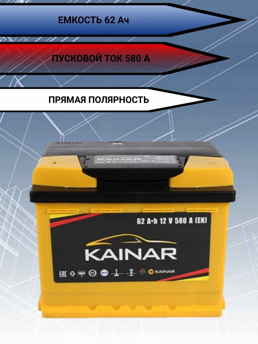 Автомобильный аккумулятор 12v KAINAR 6ст-62 Ач прямая полярность на легковую машину Lada 2101-21099, Нива, Chevrolet Lacetti, Niva, ГАЗ, ИЖ, УАЗ информация: