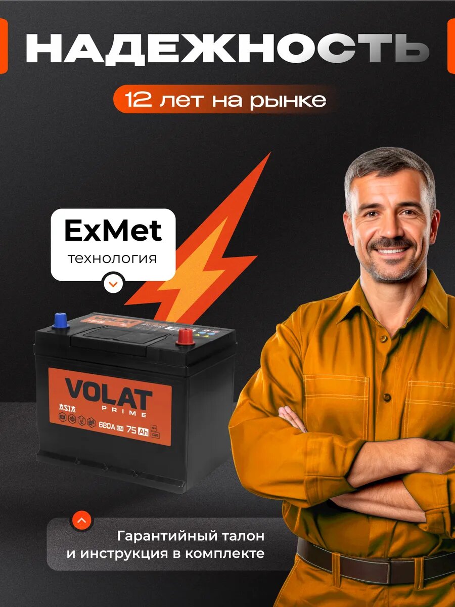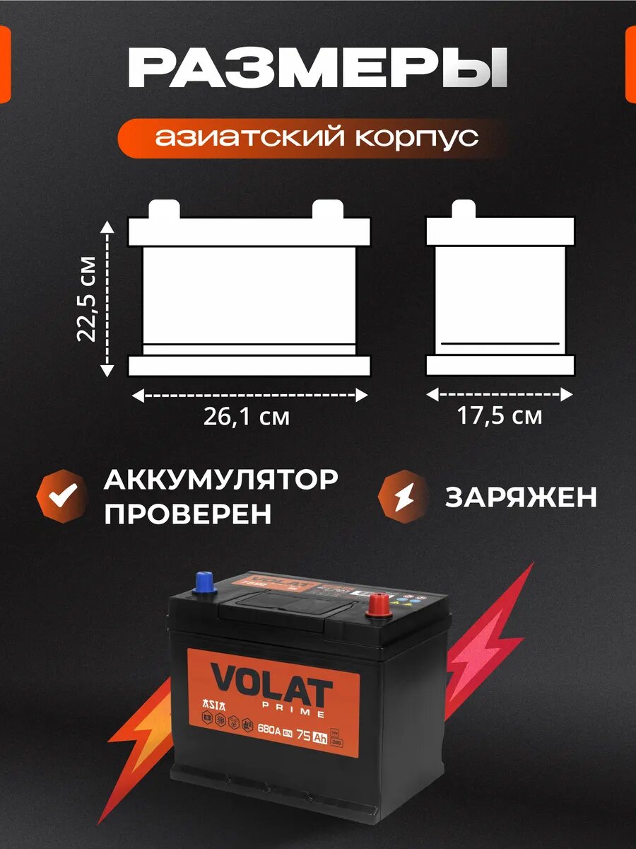 Отзывы на Аккумулятор автомобильный VOLAT Prime Asia (нижний борт) 75 Ah 680 A обратная полярность 261x175x225