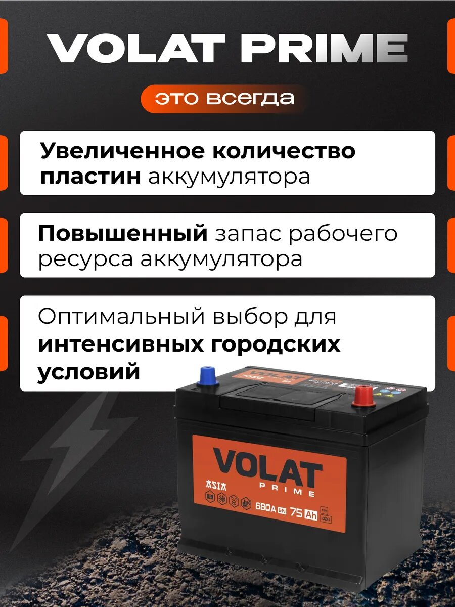 Аккумулятор автомобильный VOLAT Prime Asia (нижний борт) 75 Ah 680 A обратная полярность 261x175x225 информация: