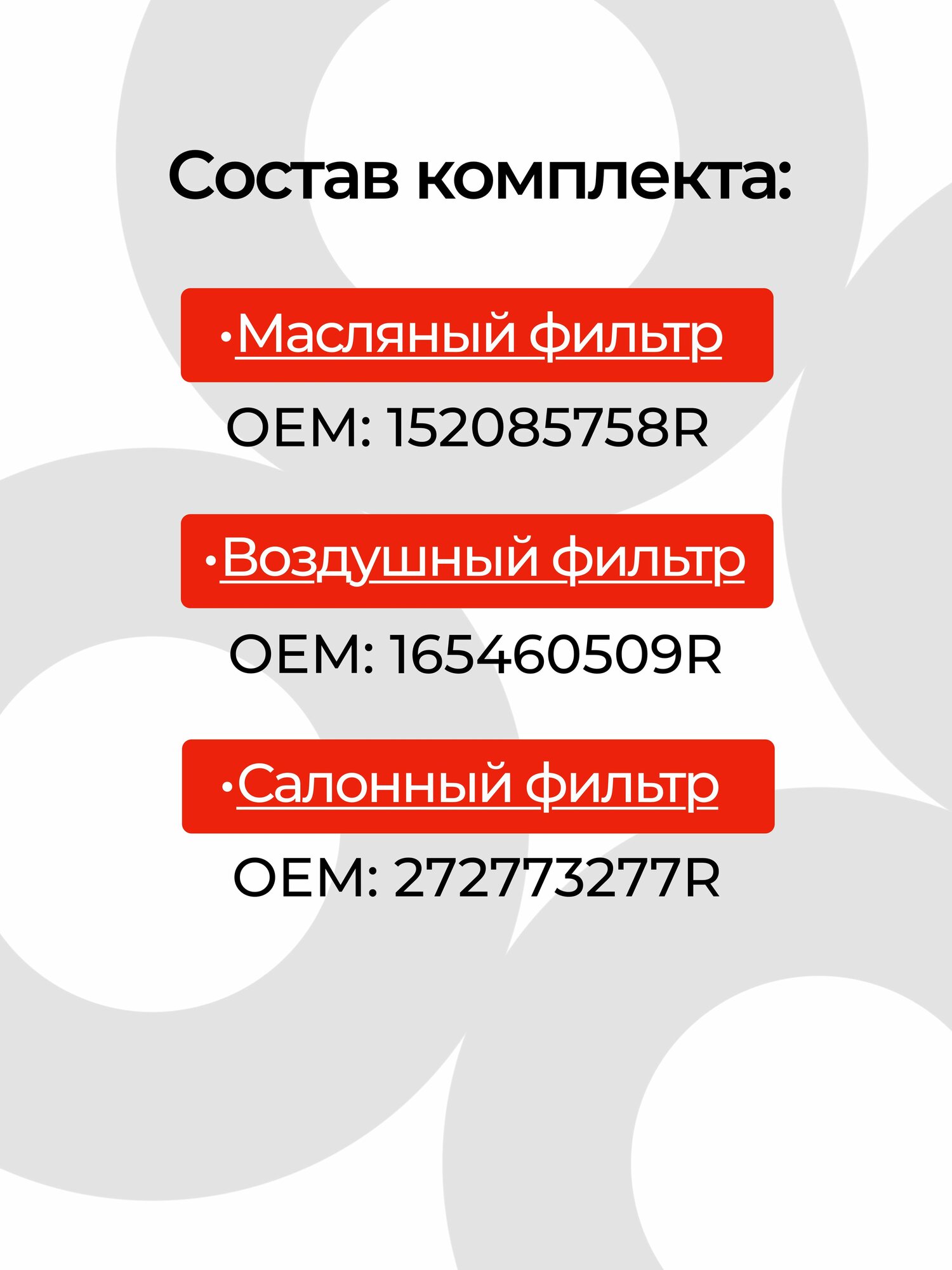 | Комплектация | Масляный фильтр C152085758R - 1 шт, воздушный фильтр С165460509R - 1 шт, салонный фильтр С272773277R - 1 шт |