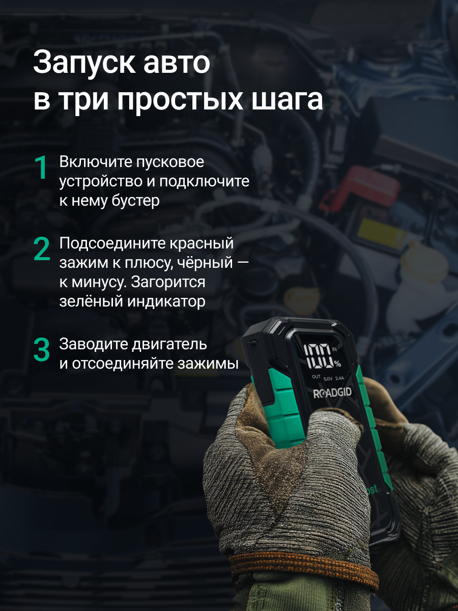 Пусковое устройство для автомобиля Roadgid CarBoost 1500 / бустер автомобильный пусковой / 1500А /12000 мАч /LED фонарь информация: