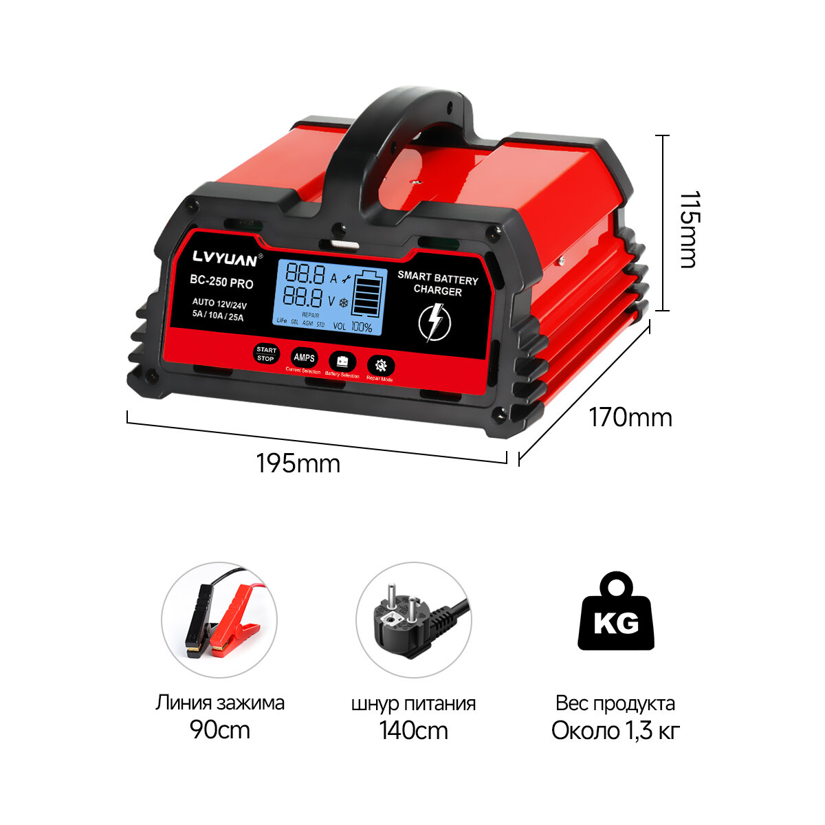 LVYUAN Зарядное устройство для аккумулятора 25A зарядное устройство ремонтного типа с автоматической адаптацией 12В/24В информация:
