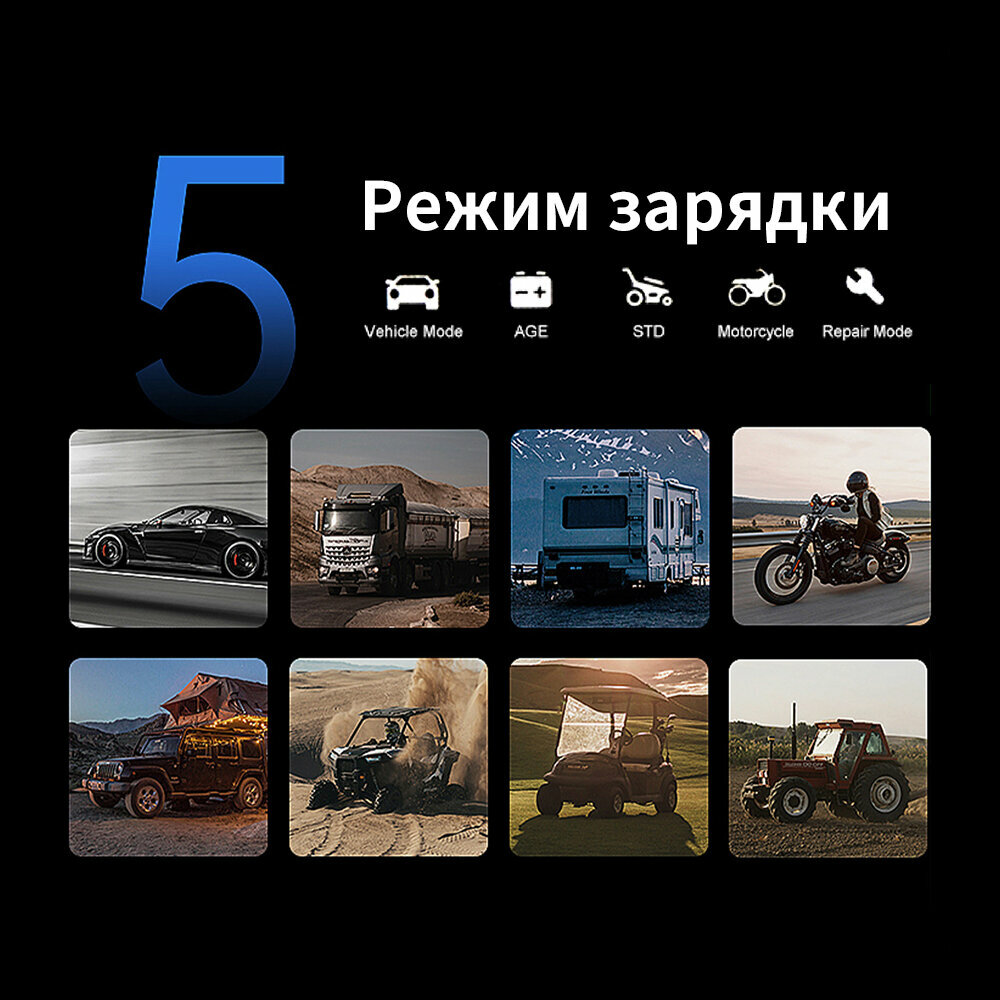 | Функции | автоматическое отключение зарядки / встроенный амперметр / встроенный вольтметр / подходит для AGM/GEL аккумуляторов / предпусковая зарядка / режим зимней зарядки / тест состояния АКБ |