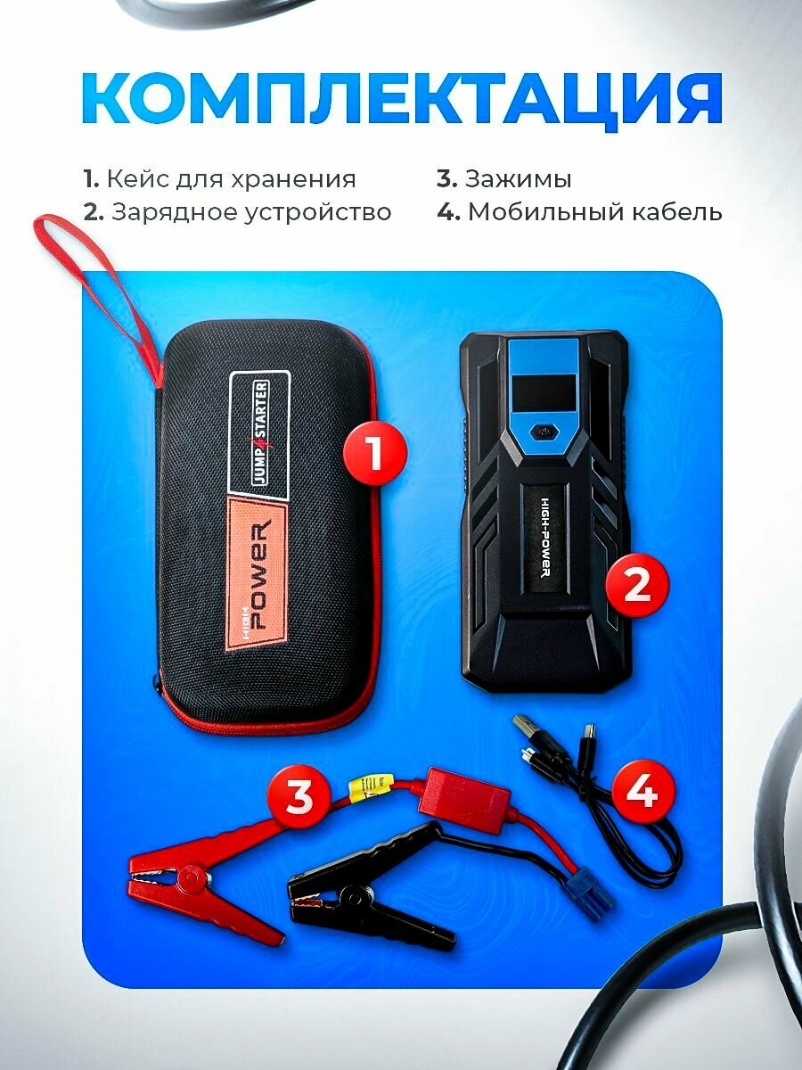 | Комплектация | Пусковое устройство Провода "Крокодилы" Кабель зарядки Кейс |