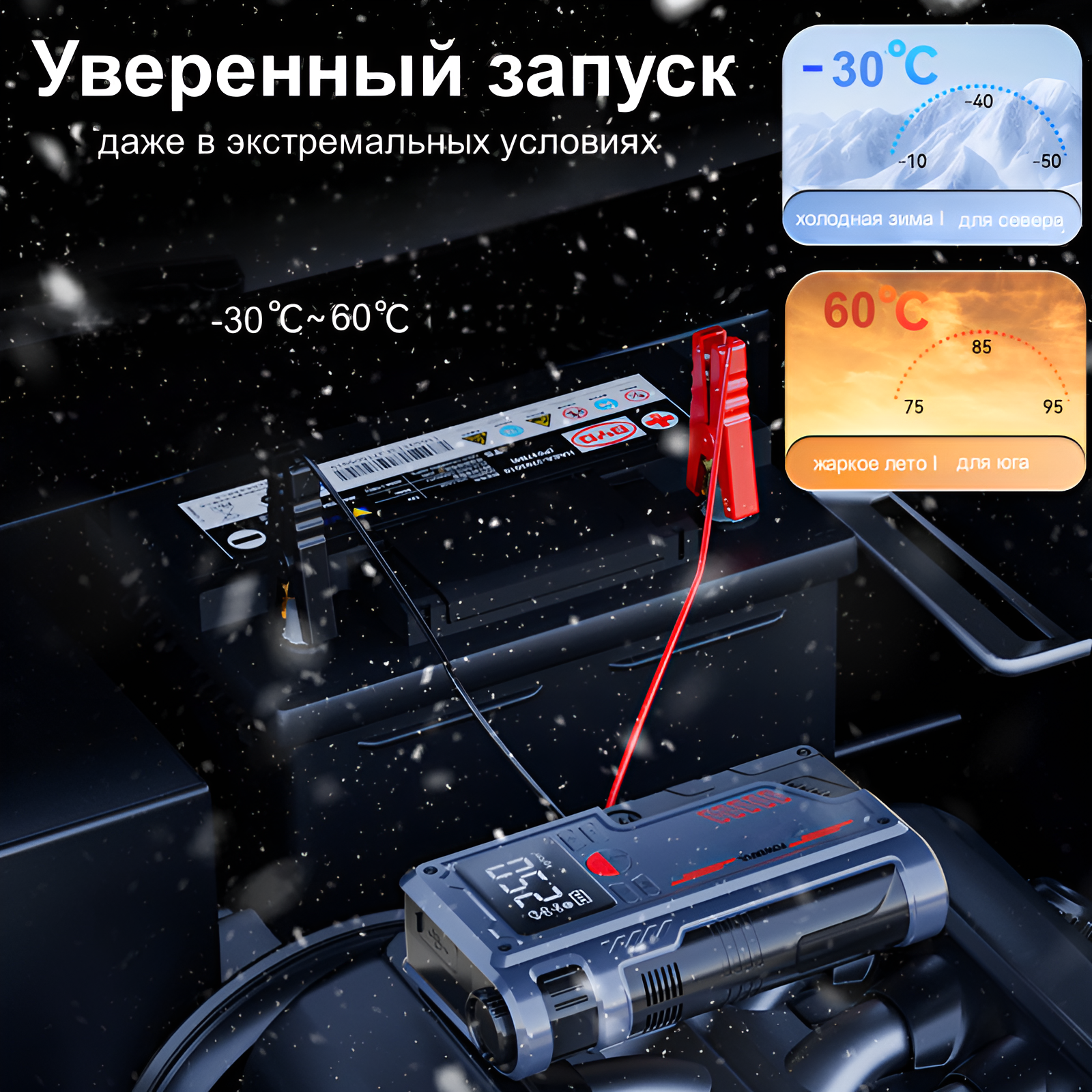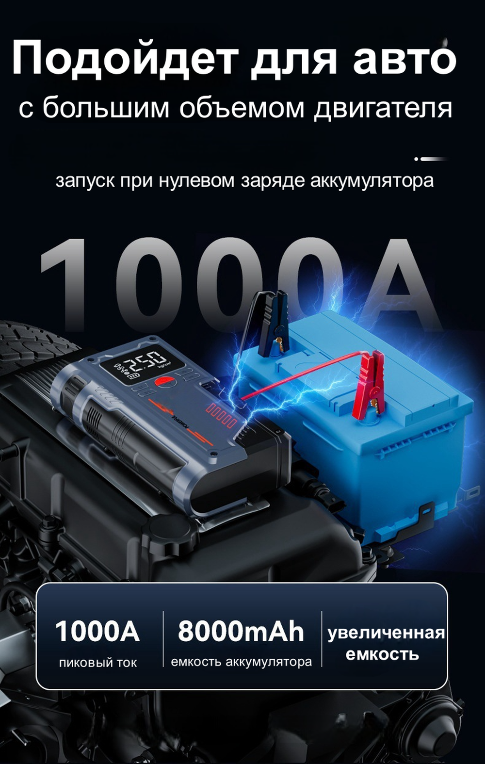 | Комплектация | Пусковое устройство, набор насадок, умные зажимы (крокодилы), шланг для подскачки шин, кабель type-c. |