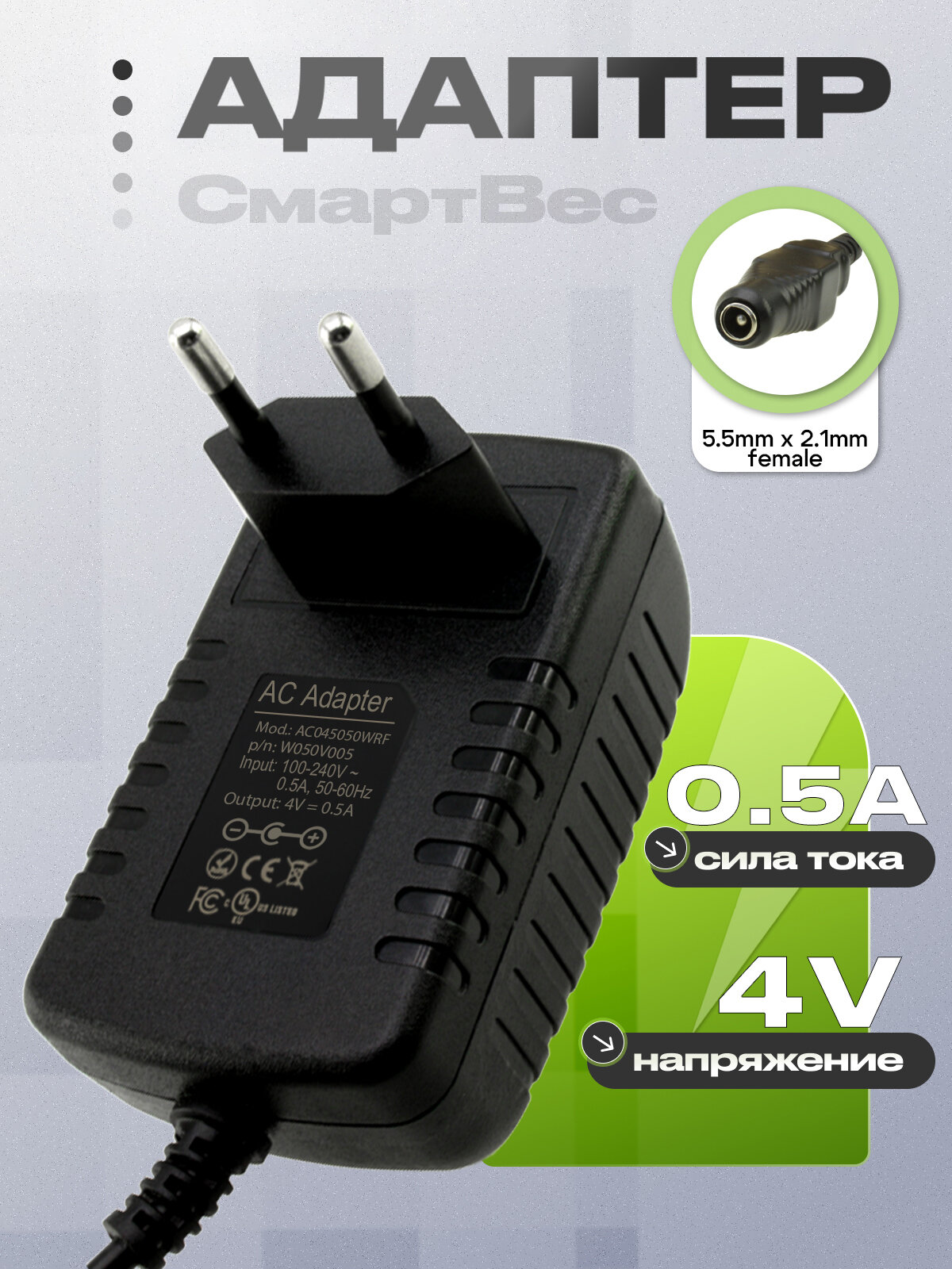 Зарядное устройство AC045050WRF, 5.5mm x 2.1mm (female, гнездо), для весов СмартВес ВЭК-3000, ВЭК-10000 информация: