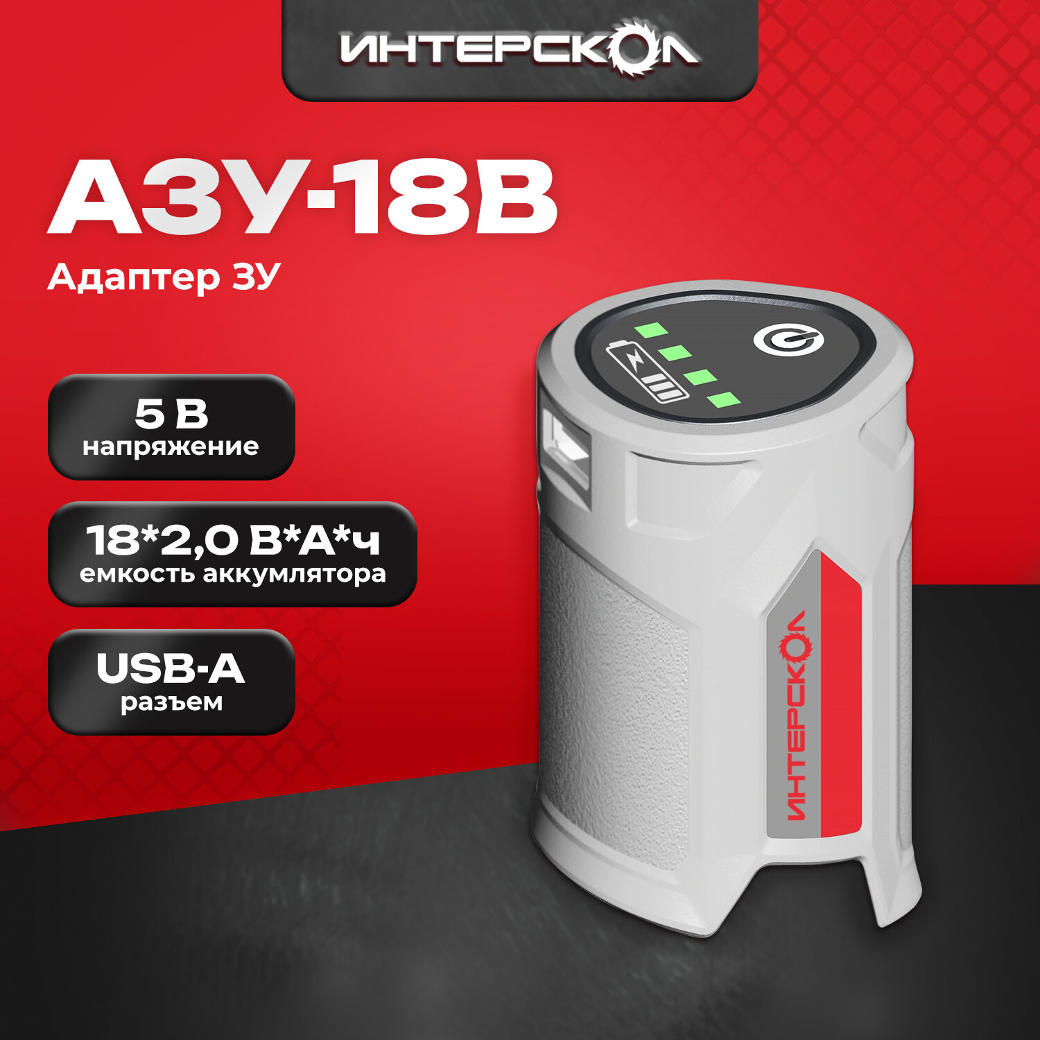 USB-адаптер на АКБ туннельного типа ИНТЕРСКОЛ АЗУ-18В, 18 В, 2.1 A, 737.1.0.00 информация: