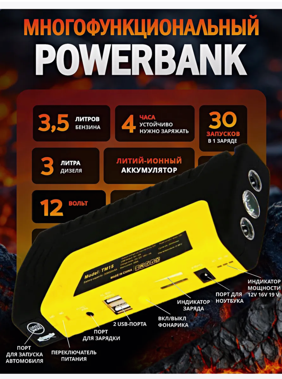 Пусковое зарядное устройство для автомобиля с компрессором, Портативное пскозарядное-устройство для автомобиля повербанк информация: