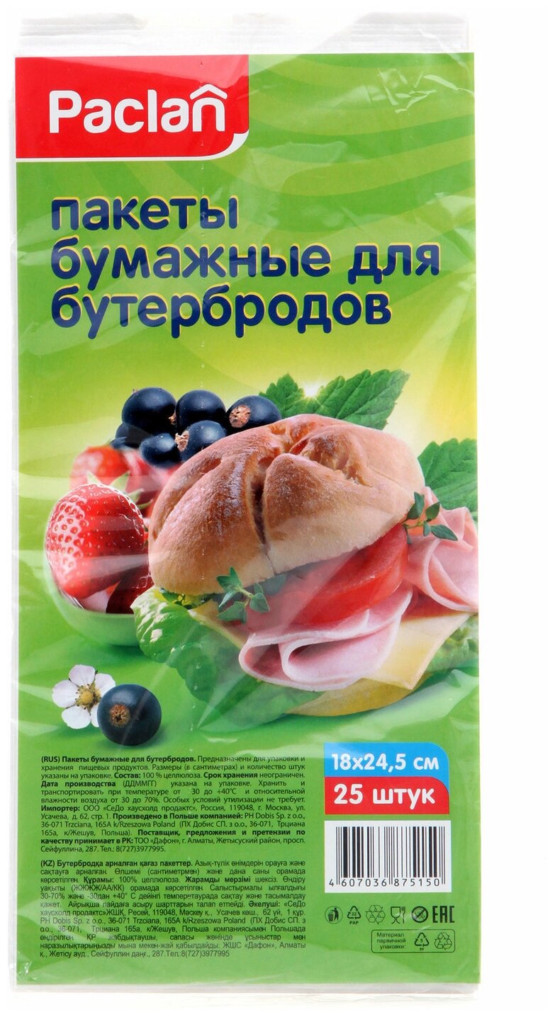 Paclan Пакеты бумажные для бутербродов 18х24,5см, 25шт. информация: