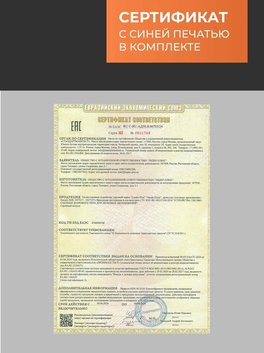 | Подробная комплектация | Фаркоп без электрики, сертификат, паспорт |