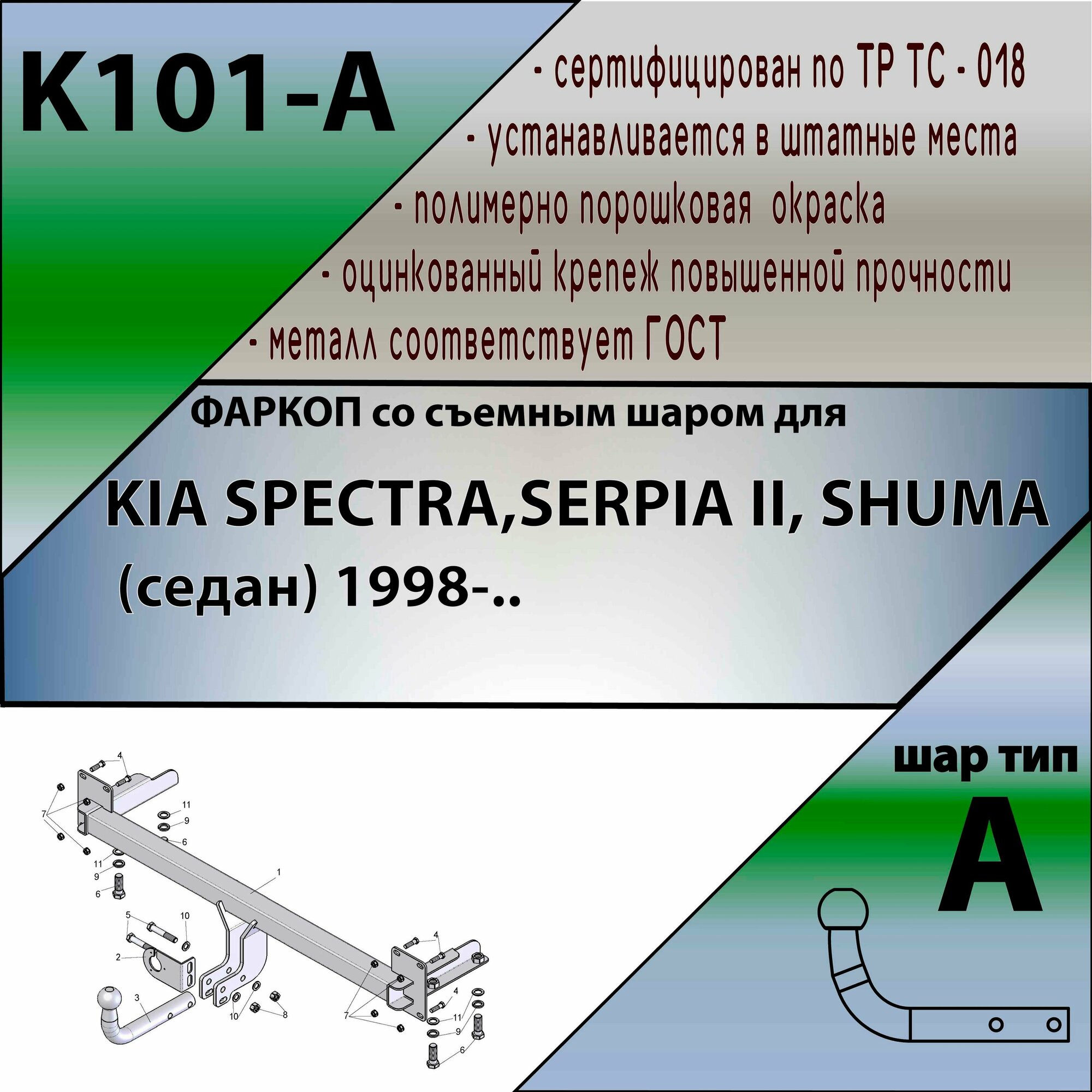 Отзывы на Фаркоп K101-A Лидер плюс для KIA SPECTRA, SERPIA 2, SHUMA (седан) 1998- (без электрики)