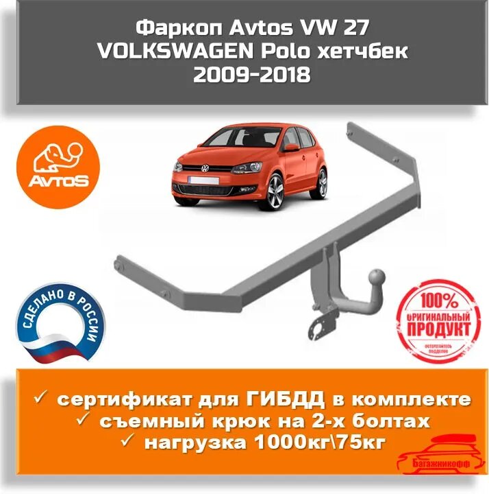 10 цен на Фаркоп Avtos VW 27 для VOLKSWAGEN Polo хетчбек 2009-2018 (паспорт и сертификат в комплекте)
