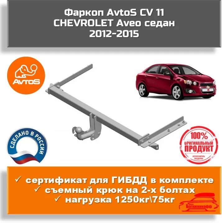 10 цен на Фаркоп Avtos CV 11 для CHEVROLET Aveo седан 2012-2015 (паспорт и сертификат в комплекте)