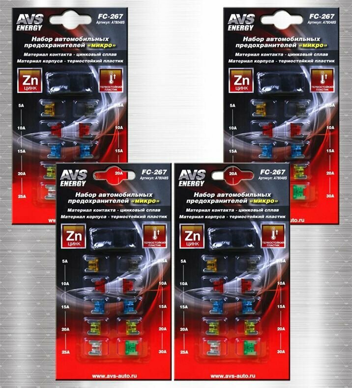Набор предохранителей AVS FC-267 "микро" в блистере комплект 4 шт. + пинцет, флажковые (ножевые) автомобильные - A78048S информация: