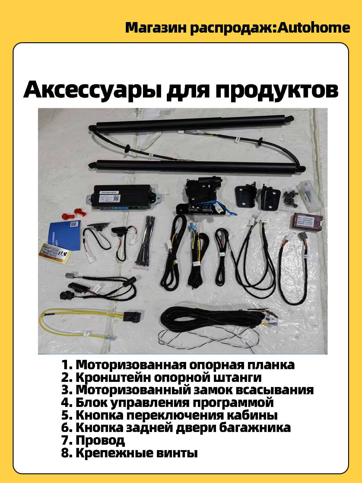 Состав набора | 1. Электропривода крышки багажника. 2. Электронный блок управления. 3. Кнопка управления закрытием крышки багажника. 4. Кнопка салона для управления открытием/закрытием багажника. 5. Комплект проводов для подключения электропривода. 6.Датчик ноги Foot Sensor для электропривода 7. Дотяжка 8. Инструкция по установке |