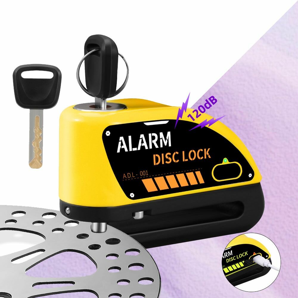 10 цен на Мотоцикл дисковый тормоз замок 4D001, Противоугонный комплекс, автосигнализация,120 дБ, перезаряжаемый, жёлтый