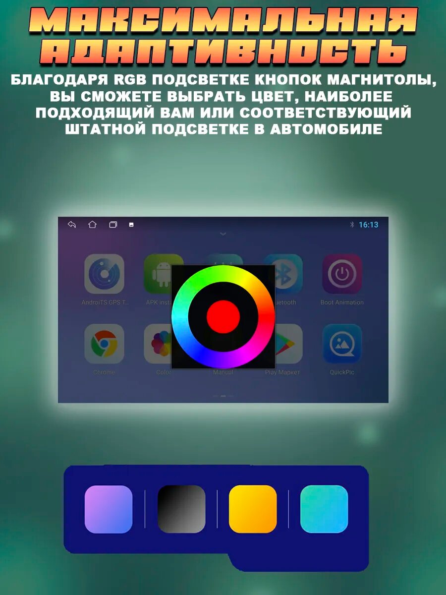 | Особенности магнитолы | DSP процессор, многоцветная подсветка, поддержка навигационных систем, поддержка приложений, подключение камеры заднего вида, эквалайзер |