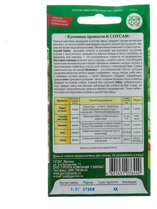Семена Кухонные пряности к соусам "Гавриш", 1,6 г информация: