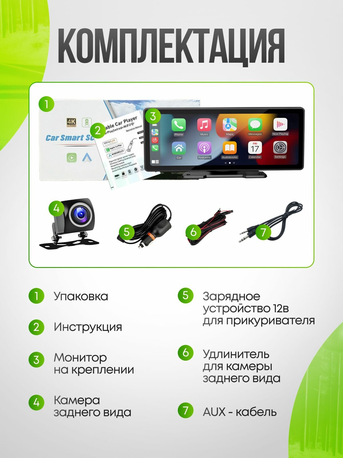 | Подробная комплектация | Монитор, кабель питания, AUX кабель, подставка, 12LED камера заднего вида |
