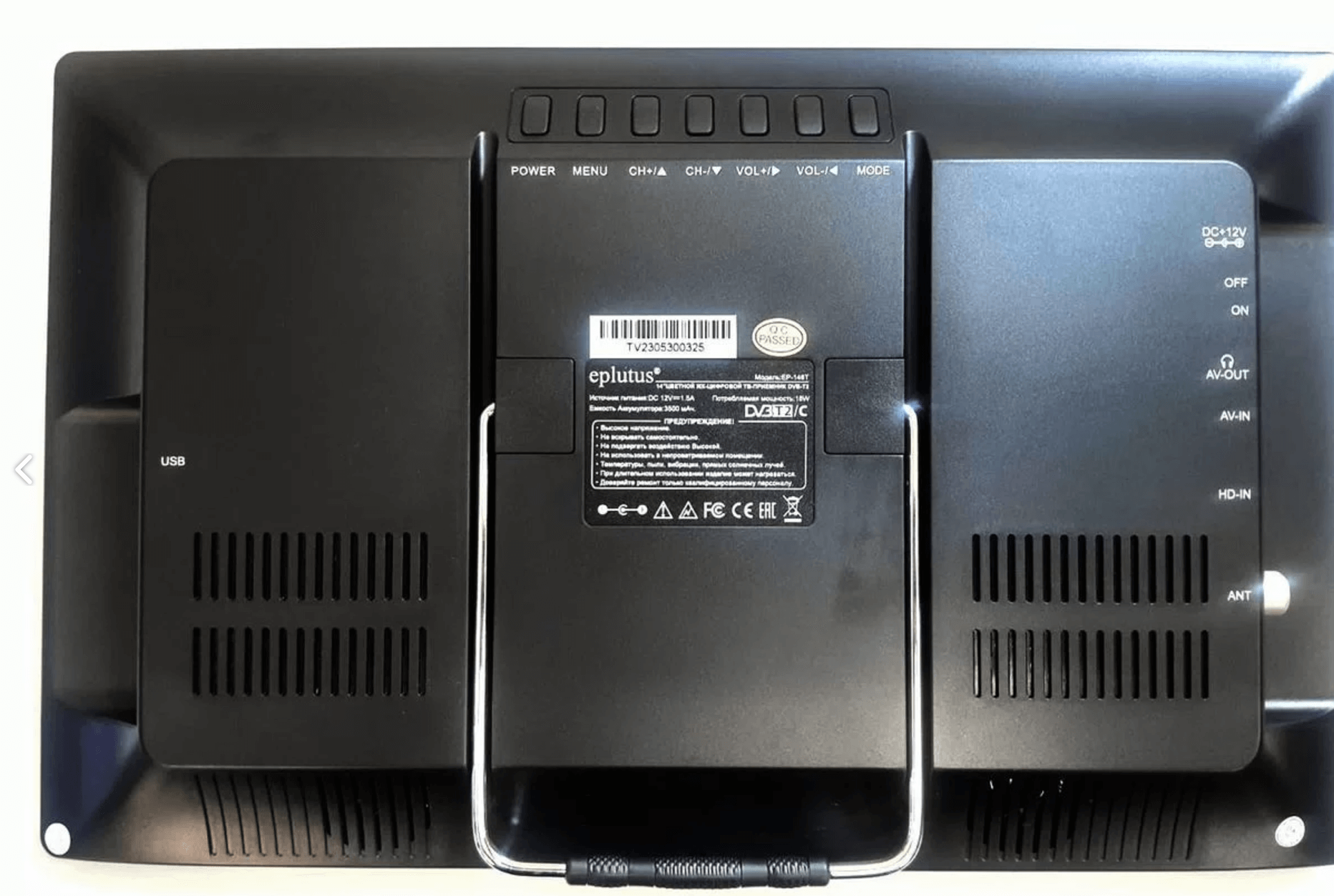 Телевизор Эплутус 143(Т)-EP (E2370EU) с TFT ЖК 14.1-дюймовым экраном и встроенным цифровым тюнером Т2 и аккумулятором 1500 мАч. Воспроизведение с USB