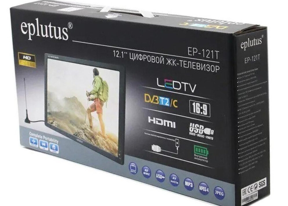 Автомобильный, цифровой телевизор Эплютус 121T 12V, магнитная антенна, встроенная АКБ. Разрешение экрана: HD 1280x800 информация: