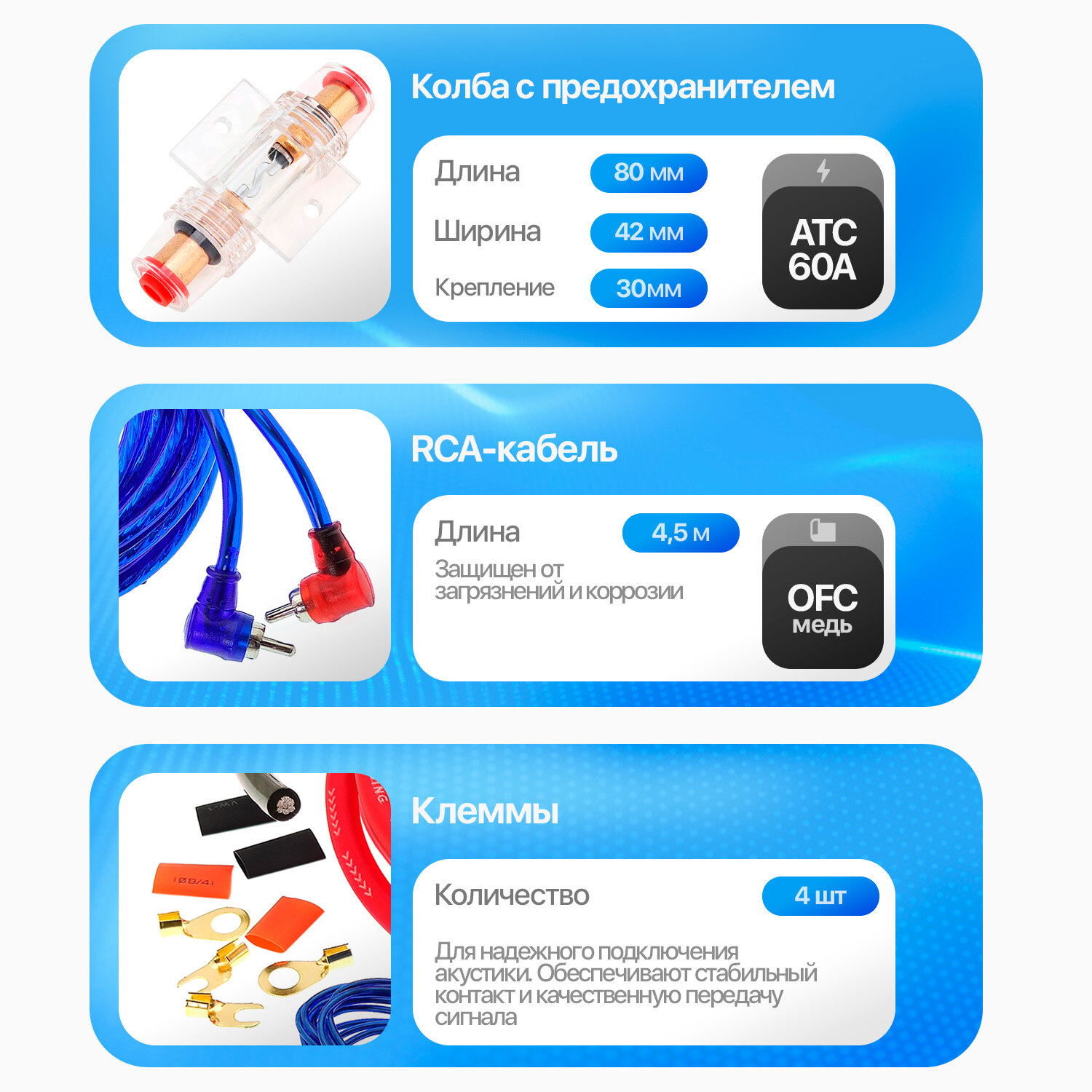 | Комплектация | Питание (красный) - 4.5м; (диаметр 3,26мм / сечение 8.35 кв.мм.) - омеднённый алюминий (CCA 30% медь) Чёрный "заземление" - 0,5м; (диаметр 3,26мм / сечение 8.35 кв.мм.) - омеднённый алюминий (CCA 30% медь) Синий Remote cantrol - 4.5м (23*0.12) Колба с предохранителем ATC 60 А Концевики RCA-кабель тройной экран - 4.5м |