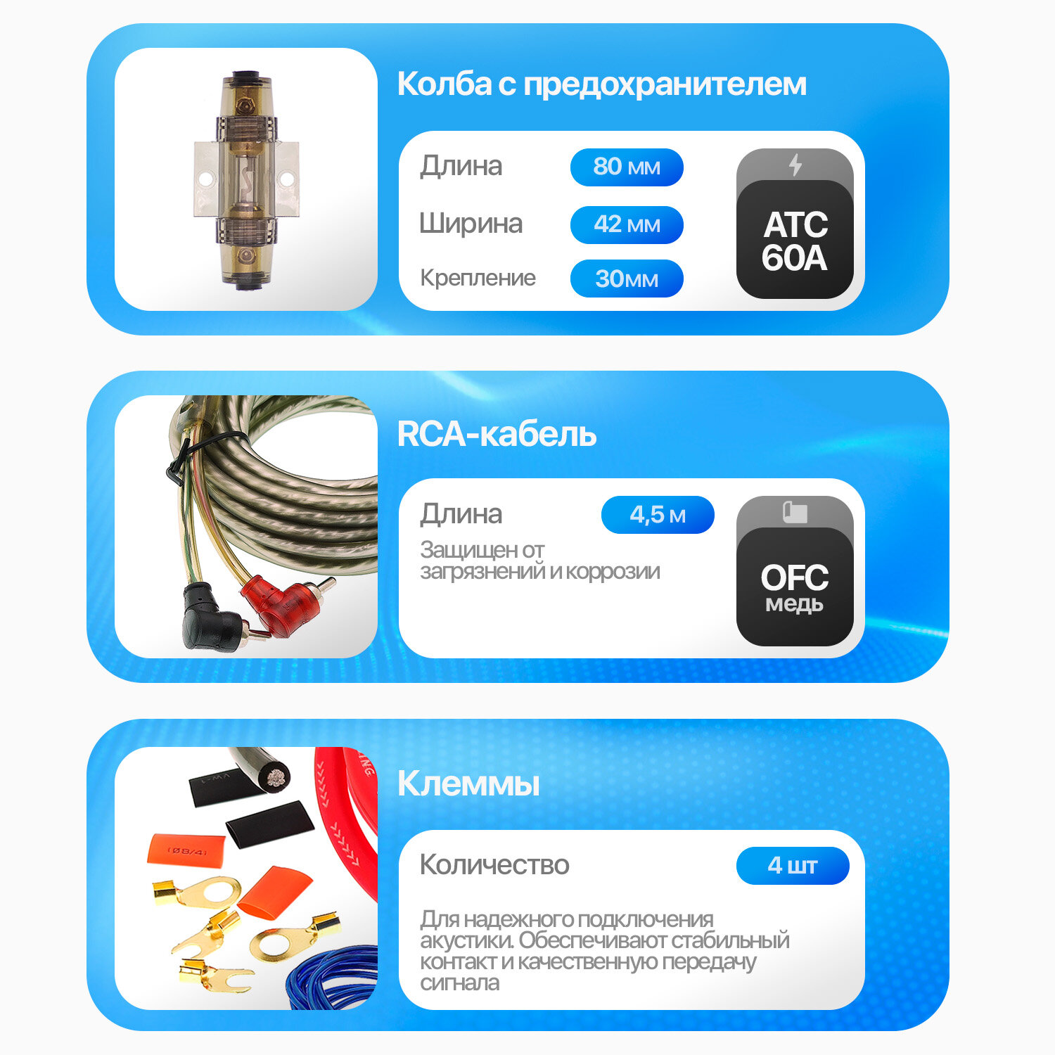 | Комплектация | Питание (красный) - 4.5м; (диаметр 3,26мм / сечение 8.35 кв.мм.) - омеднённый алюминий (CCA 30% медь) Чёрный "заземление" - 0,5м; (диаметр 3,26мм / сечение 8.35 кв.мм.) - омеднённый алюминий (CCA 30% медь) Синий Remote cantrol - 4.5м (23*0.12) Колба с предохранителем ATC 60 А Концевики RCA-кабель тройной экран - 4.5м |