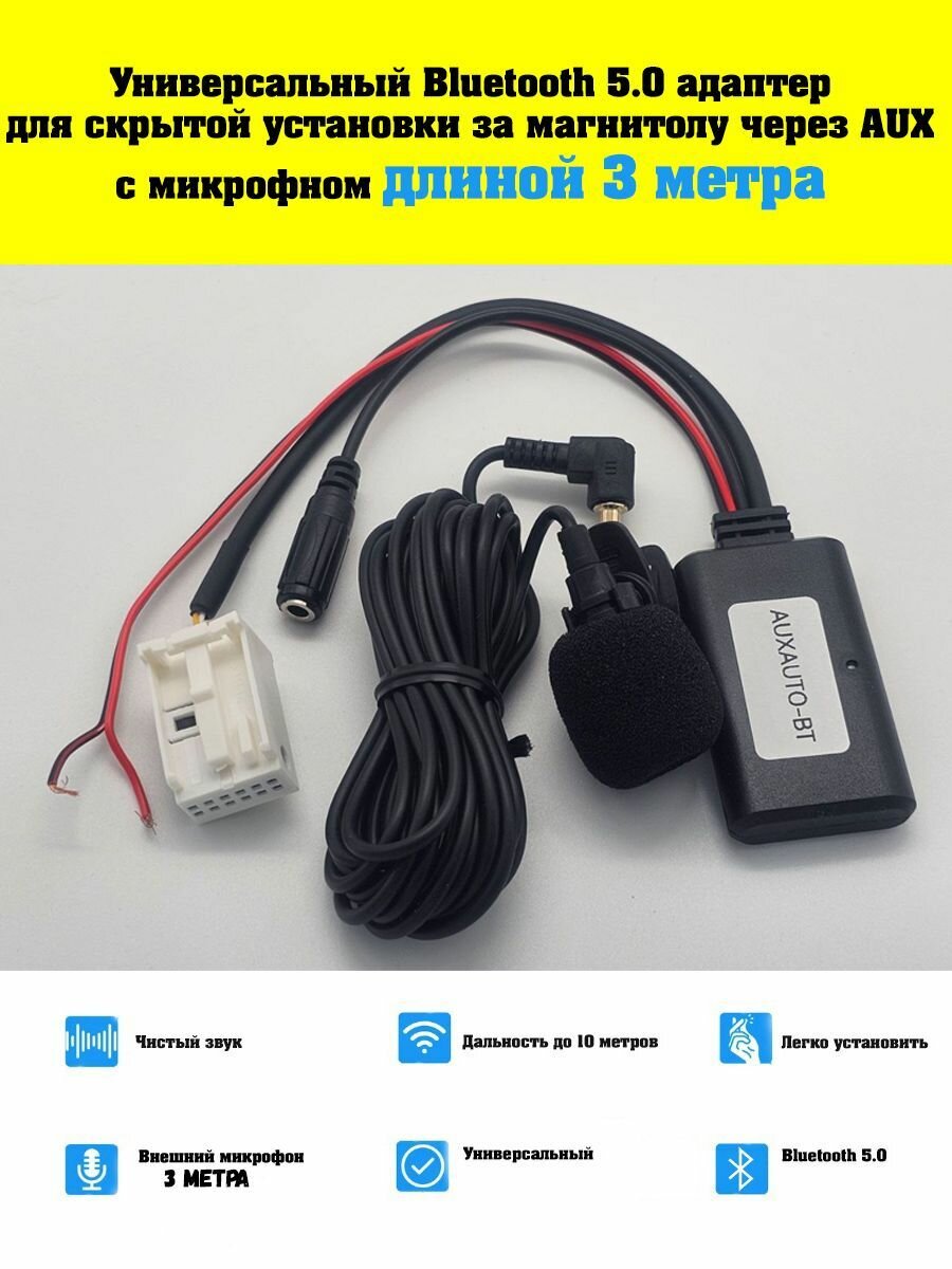 Bluetooth AUX адаптер в машину 12 pin универсальный / блютус для штатных магнитол с микрофоном 3 метра, скрытая установка / auxauto информация: