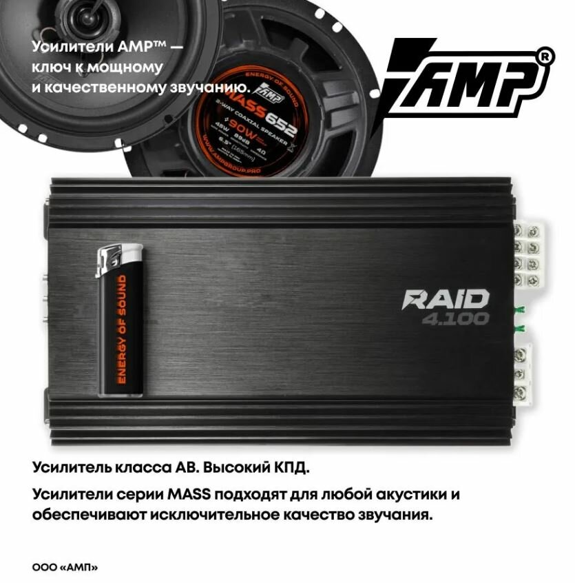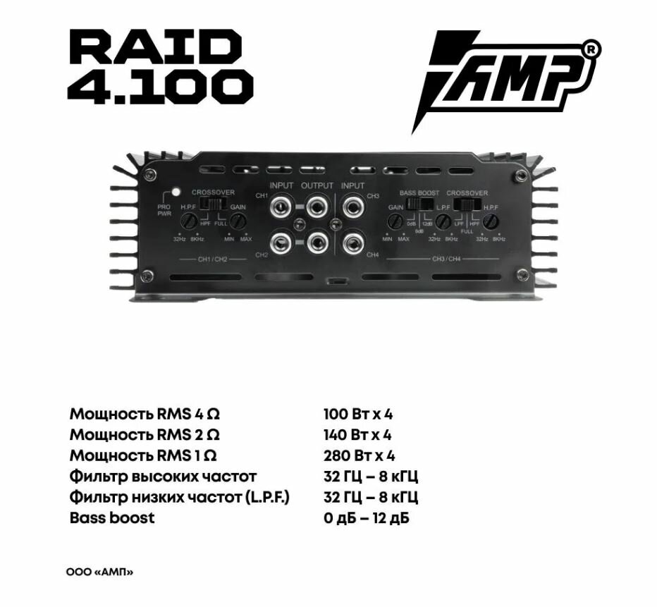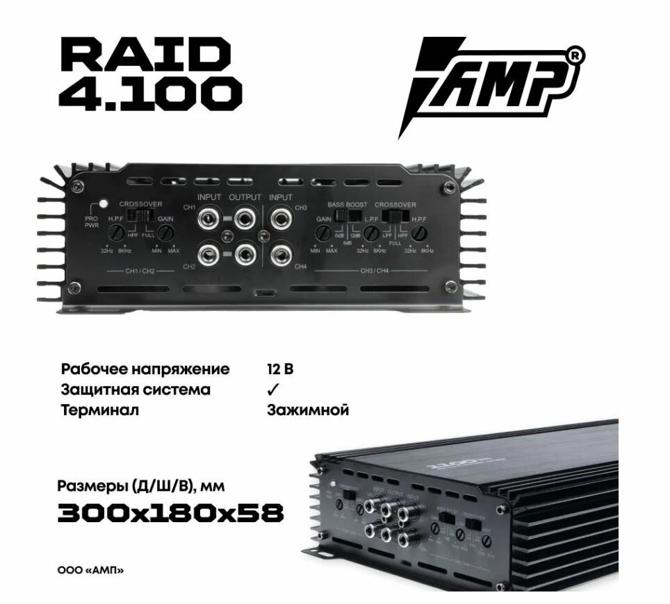 Усилитель автомобильный AMP RAID 4х канальный для динамиков, 100Вт, 140Вт - 2ом информация: