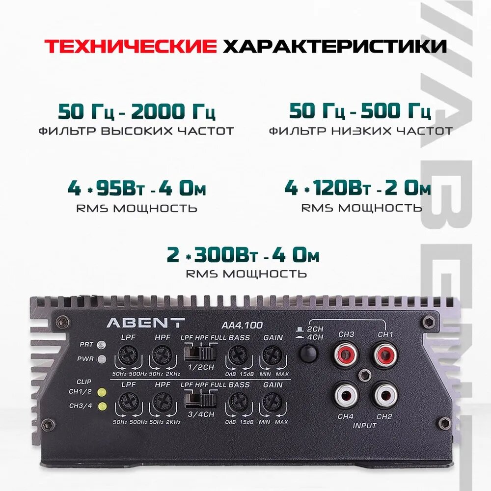 Усилитель ABENT AA4.100, 4 канала, Bass Boost, 120/95 Вт, Class A/B информация: