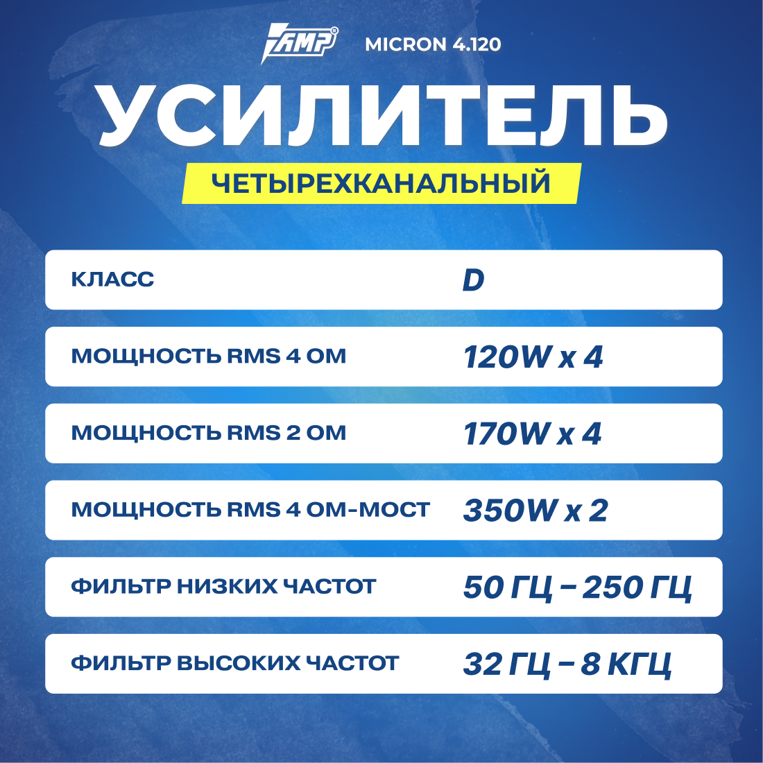 Усилитель AMP MICRON 4.120, мощность 4х120Вт, технология AMP информация: