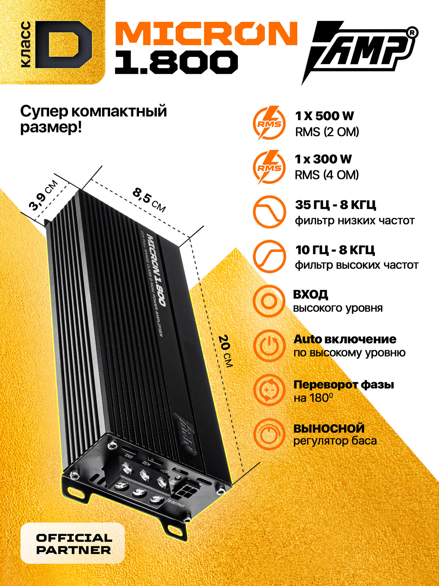 10 цен на AMP MICRON 1.800 Усилитель для сабвуфера одноканальный моноблок; max 1400w; ультракомпактный D-class