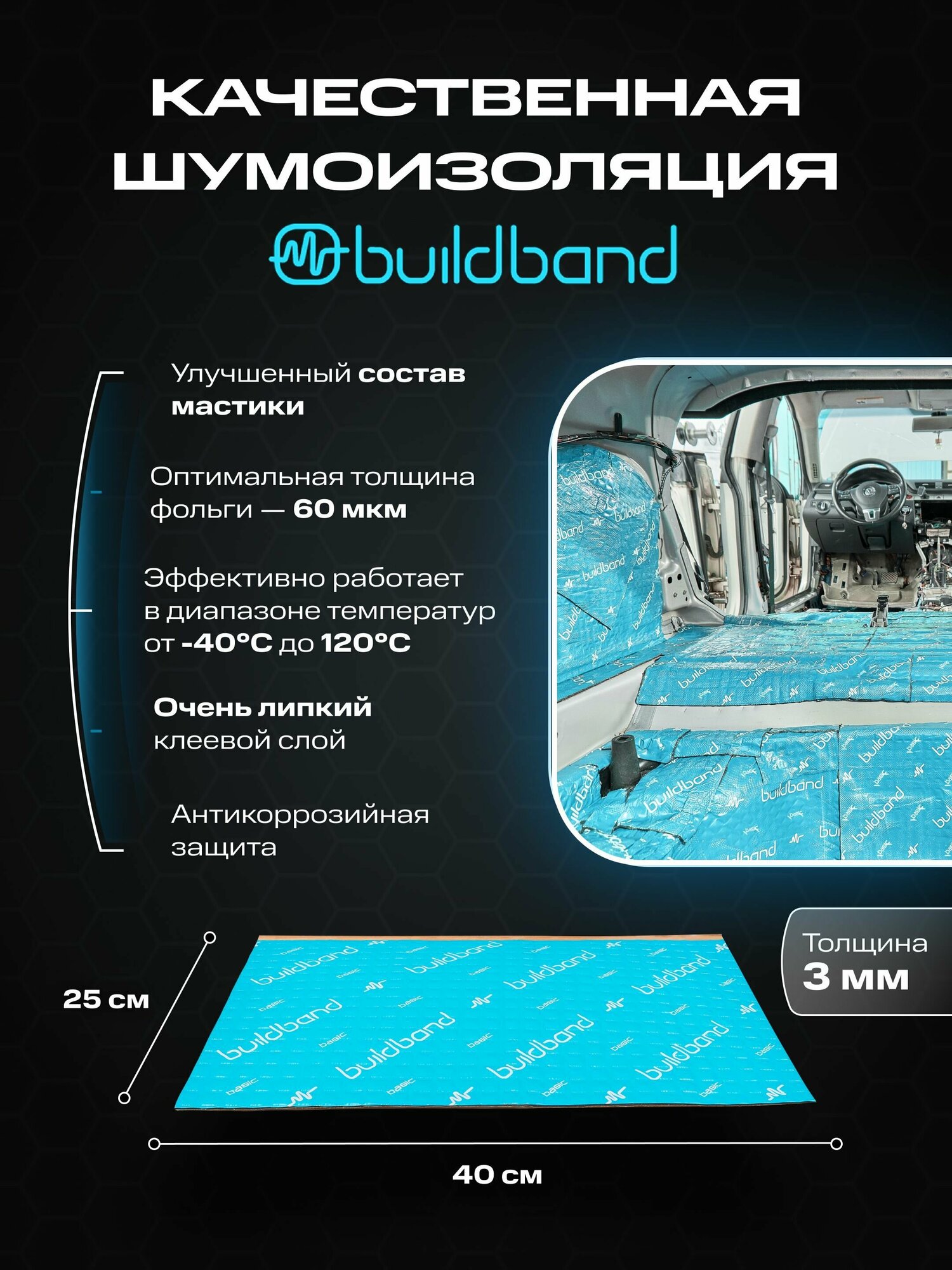 Шумоизоляция автомобиля, buildband BASIC 3 мм, комплект 20 листов. Виброизоляция для авто, шумка самоклеящаяся, звукоизоляция информация:
