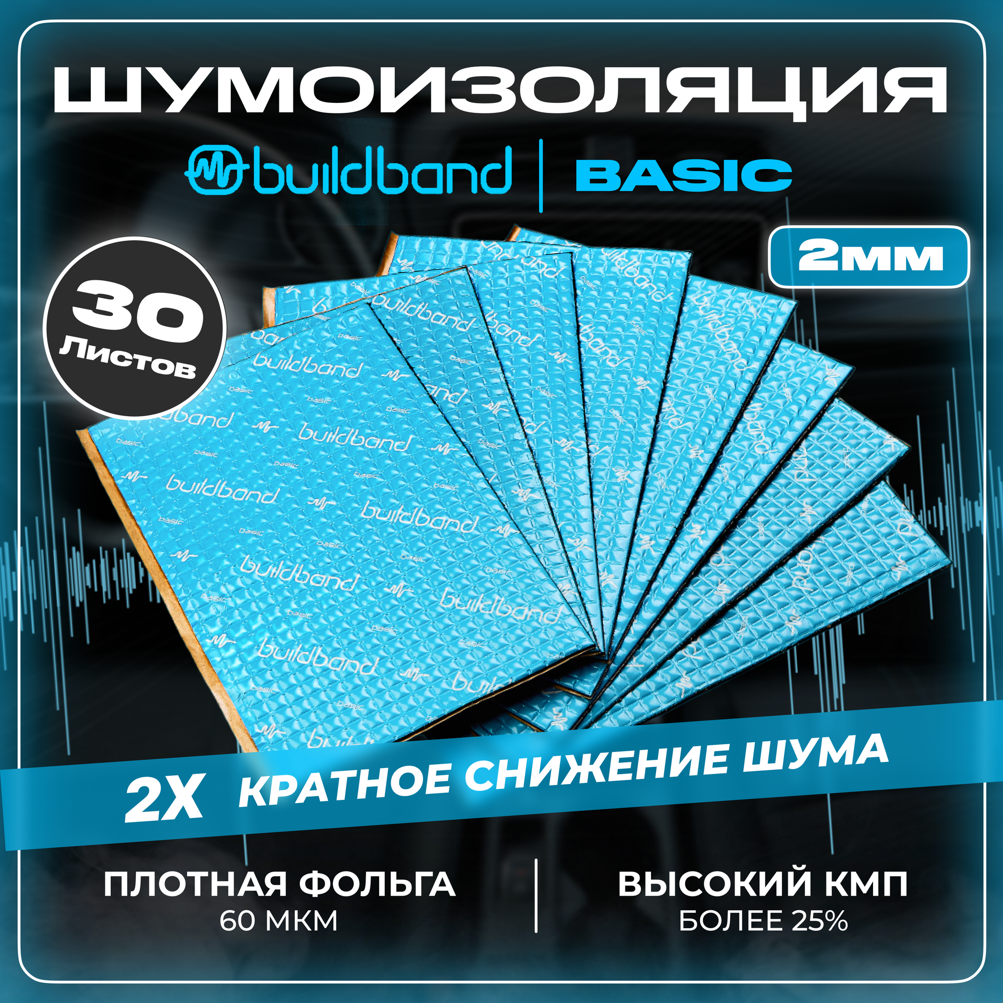 Шумоизоляция автомобиля, buildband 2 мм, комплект 30 листов. Виброизоляция для авто, шумка самоклеящаяся, звукоизоляция информация: