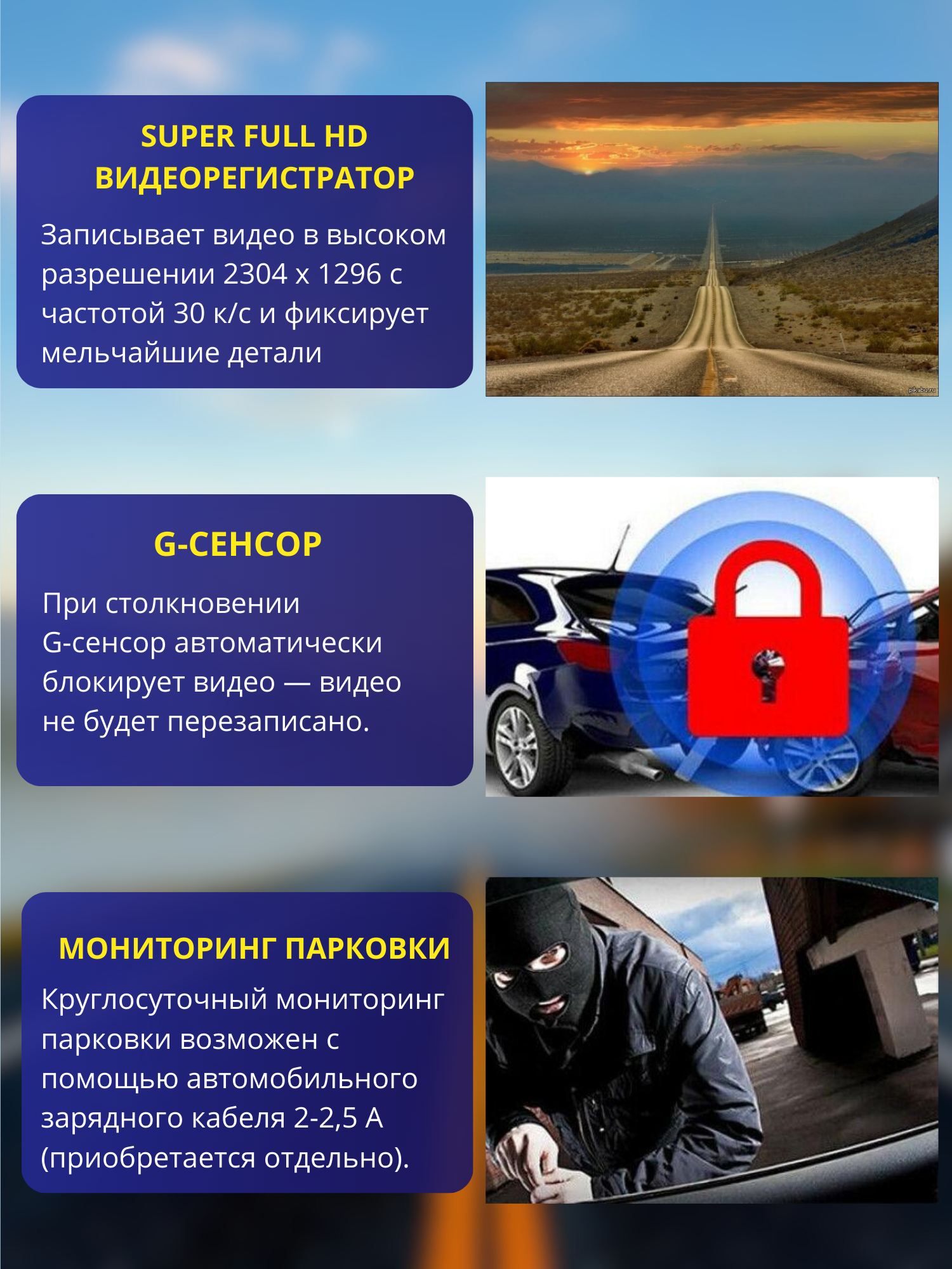 Автомобильный видеорегистратор, 3 камеры, с датчиком удара G-Sensor, HDR